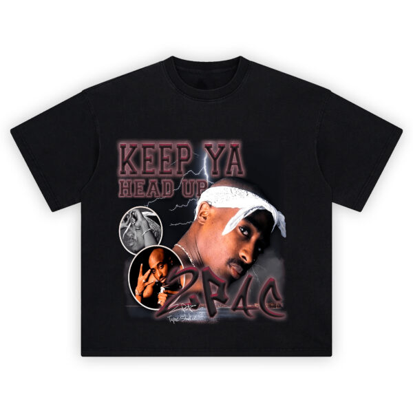 Celebrate a hip-hop icon with the bold and electrifying 2Pac T-Shirt. This tribute tee features the legendary Tupac Shakur under stormy skies, flanked by powerful portraits and iconic gestures, all centered around the message that still resonates—Keep Ya Head Up. It’s more than just merch; it’s a movement, a message, and a memory.