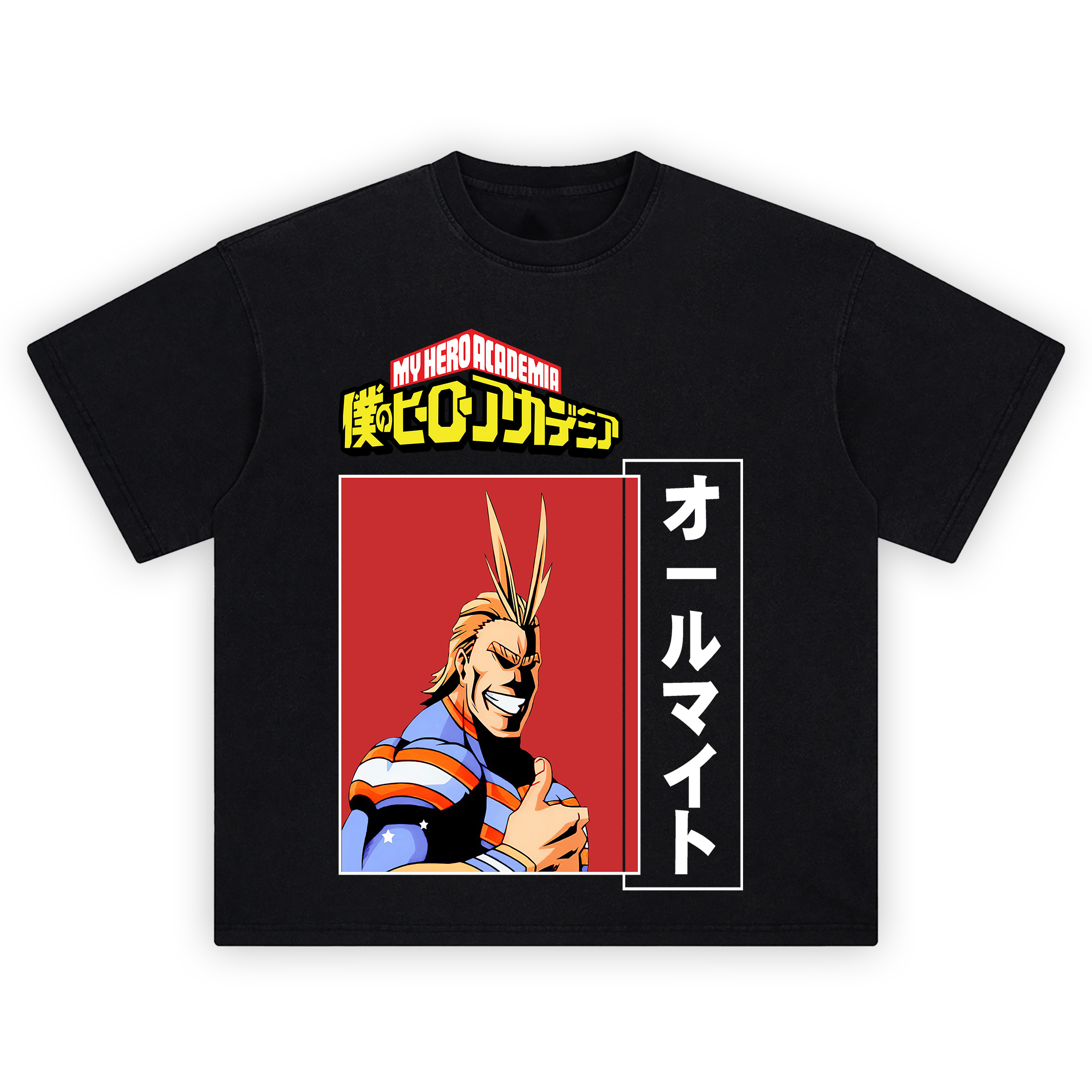 The All Might Shirt packs pure hero optimism into a clean, poster-ready layout. Front and center, the Symbol of Peace flashes a confident thumbs-up, grin blazing beneath sharp brows and gravity-defying hair spikes. His classic red-white-and-blue suit pops with bold cell-shaded highlights, while a solid red frame boxes the pose like a splash page. The All Might Shirt balances sleek composition with fan-favorite details: crisp white border lines, a vertical column of Japanese text along the right, and the series header stacked above for instant recognition. Heavy inks carve the shoulder stripes and gaunt forearm planes, giving the figure real weight without clutter. From across the room it reads like a theater marquee—bright, heroic, impossible to miss; up close you’ll catch the layered shading on the cheekbone, the star accents on the sleeve, and the subtle edge lights that contour the suit. Style the All Might Shirt with black denim and fresh kicks for con floors or everyday “Plus Ultra” energy, or throw it under a varsity jacket so the red frame and kanji peek at the sides. If your rotation lives for bold typography, iconic silhouettes, and graphics that feel like a key visual, the All Might Shirt is the instant mood boost your lineup needs.