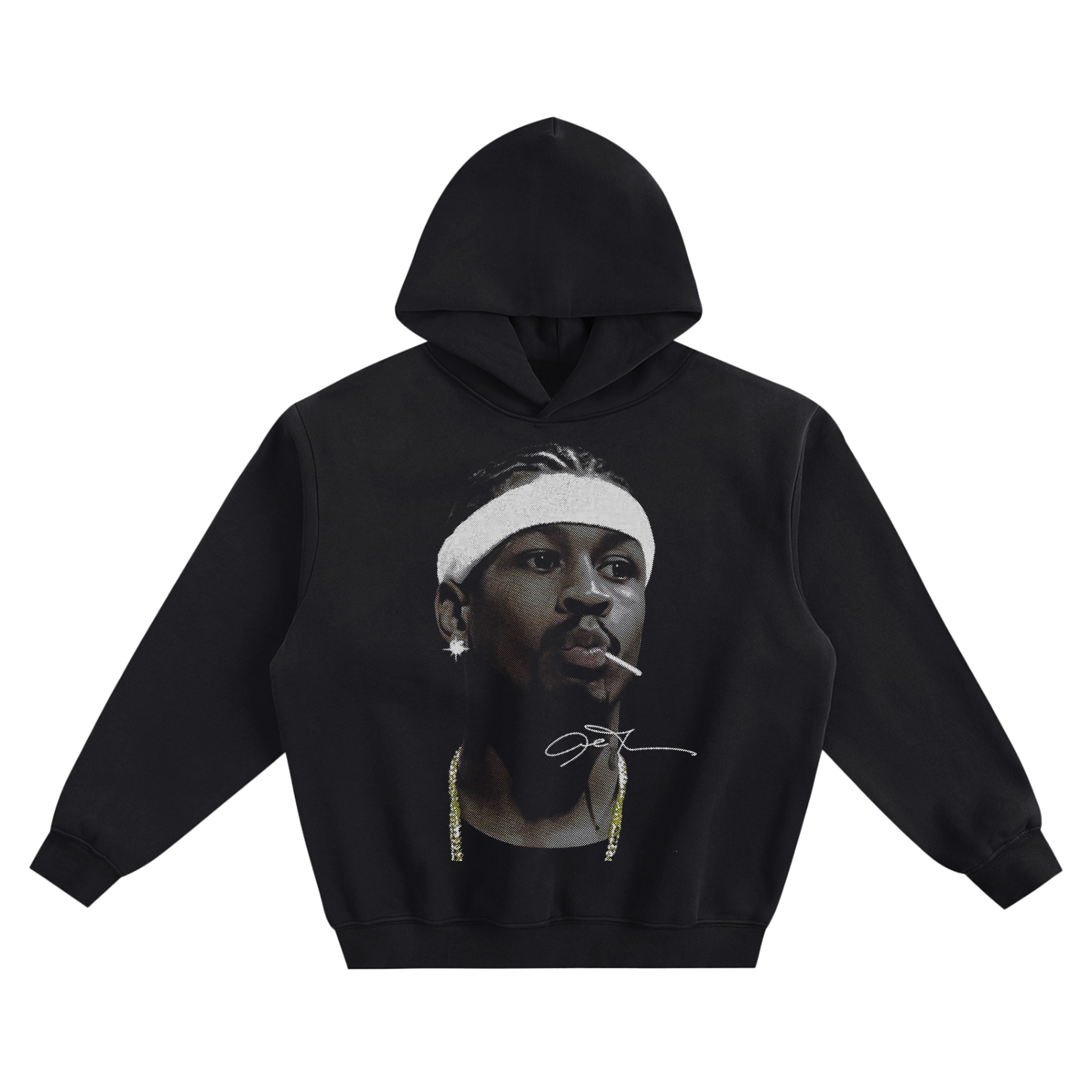 Bring raw attitude and instant recognition to your lineup with the Allen Iverson Big Face Hoodie—a bold portrait graphic that hits on sight. The front artwork features a close-up of Allen Iverson turned slightly to the side, with a bright white headband wrapping the forehead and tight braids visible above it. The expression is calm but alert, eyes looking off-frame as if he’s tracking the next move.