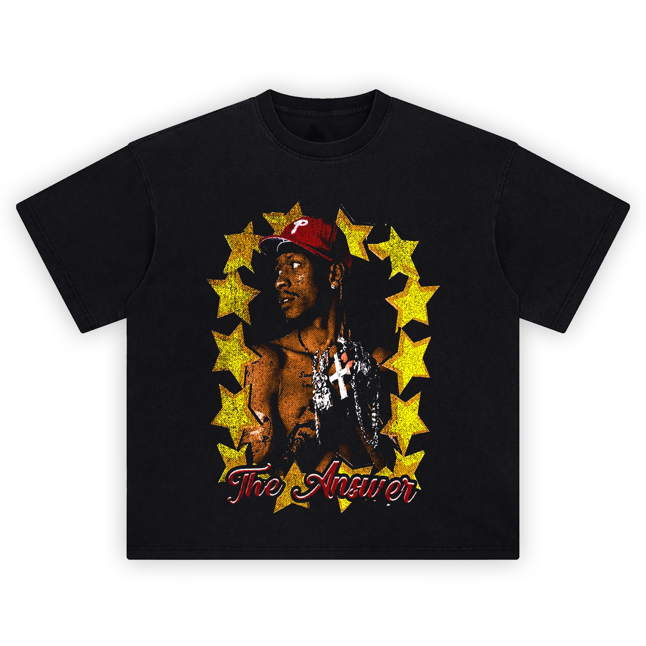 The Allen Iverson Shirt brings throwback tunnel swagger to your lineup with a clean, vintage halftone finish. Centered on deep black, a young icon looks left in a red cap, bare chest ink on display, and heavy chains stacked high—one crowned by a bold cross. A ring of bright yellow stars surrounds the portrait like a spotlight, pushing the silhouette forward while keeping the layout uncluttered. Down below, a glossy red script spells “The Answer,” sealing the moment with era-perfect attitude. The dot-texture treatment gives the Allen Iverson Shirt that poster-print grain fans love, adding depth to the cap brim, chain links, and skin tones without muddying the image. From a distance, the composition reads loud and confident; up close, the halftone dots and metallic highlights reward a second look. Pair the Allen Iverson Shirt with black denim and crisp sneakers for watch parties, pickup runs, or everyday streetwear; throw it under a varsity jacket so the stars and red script peek from the hem. This is nostalgia distilled—no busy collage, just one legendary look framed for maximum impact. If your rotation lives for hoops culture, mixtape-era flair, and graphics that feel archival, this Allen Iverson Shirt is a first-ballot cop.