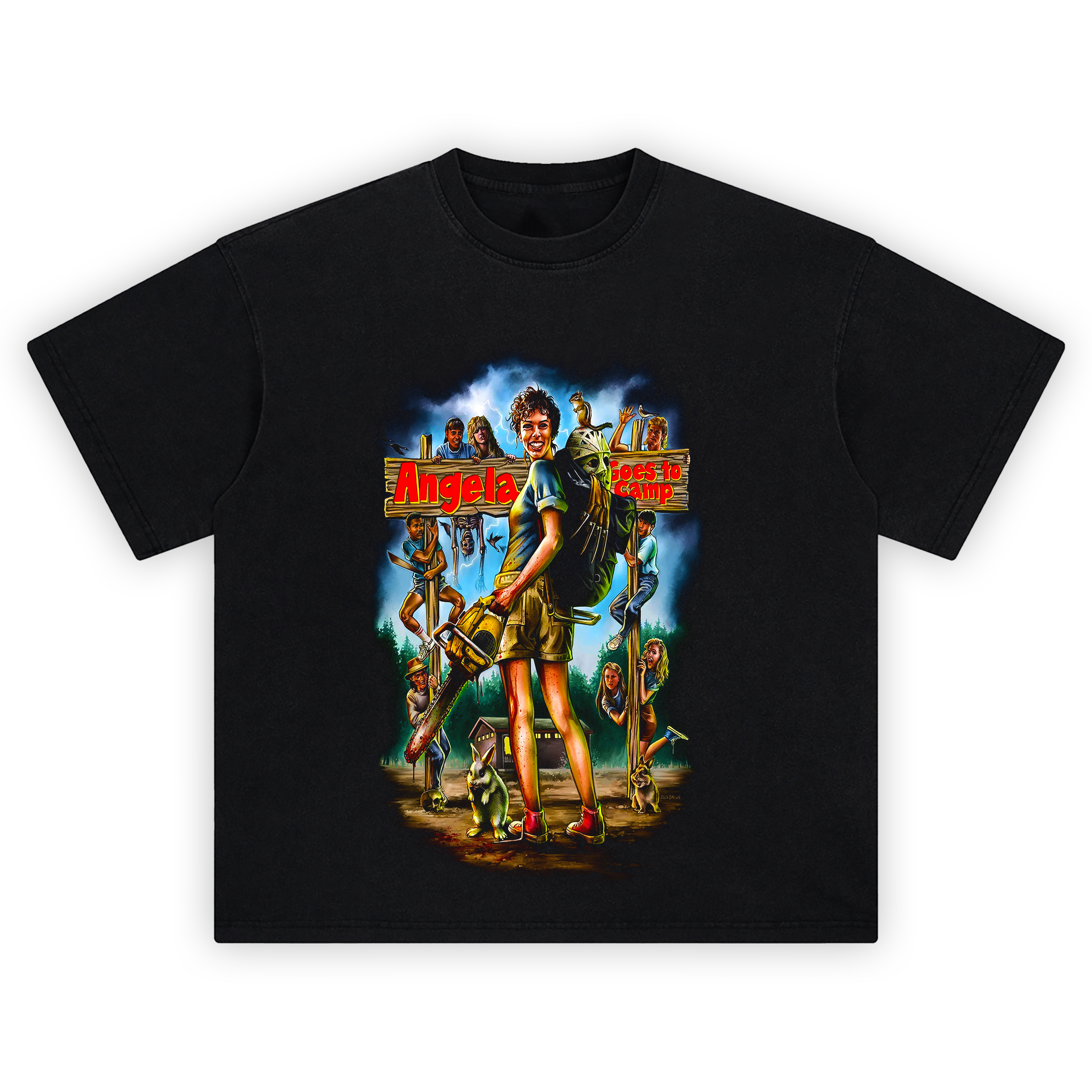 Get ready for the bloodiest summer retreat in horror-comedy history with the Angela Goes to Camp Horror Comedy T-Shirt! Inspired by the iconic character from the cult Sleepaway Camp series, this tee brings together brutal slasher vibes and cartoonish campy fun into one unforgettable design.