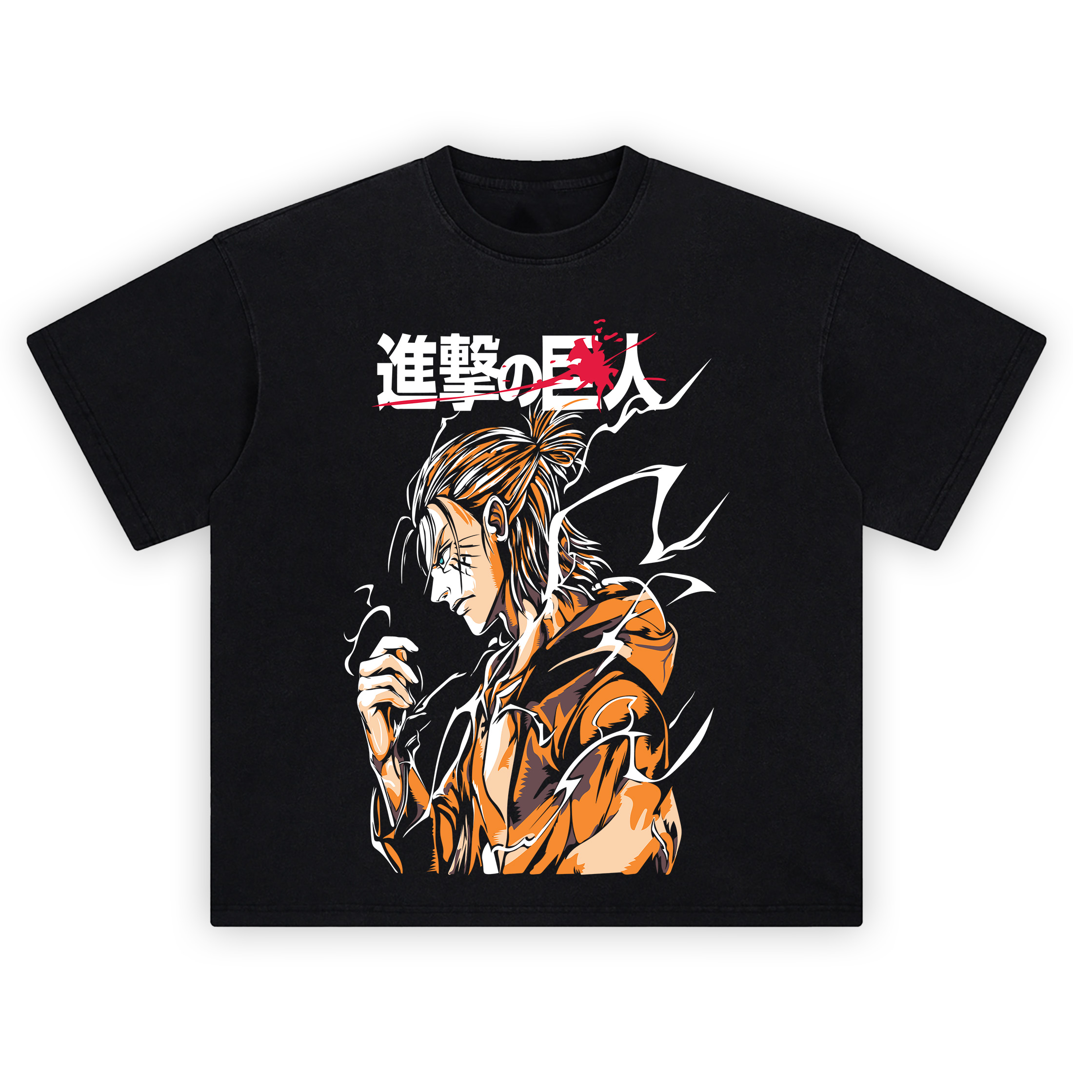The Attack on Titan Shirt goes full anime heat with a razor-sharp vector profile that looks ripped from a climactic panel. A long-haired fighter faces left, hair tied back, eyes blazing under heavy ink lines while white lightning cracks around the body like transformation energy. Up top, the bold Japanese title slams across the frame with a red slashed splatter—instant recognition for anyone who binged late nights. The palette stays punchy: burnt orange jacket, bone-white highlights, deep shadow blocks, and that clean black background letting the motion lines breathe. This Attack on Titan Shirt nails that “freeze the episode and screenshot it” vibe—tight side composition, aggressive brush contours, and just enough negative space to feel like a poster. Rock the Attack on Titan Shirt with black cargos and a tech jacket; let the kanji header and lightning streaks steal the spotlight at cons, street snaps, or marathon rewatches. No fluff, no filler—just pure shounen drama, captured mid-spark.