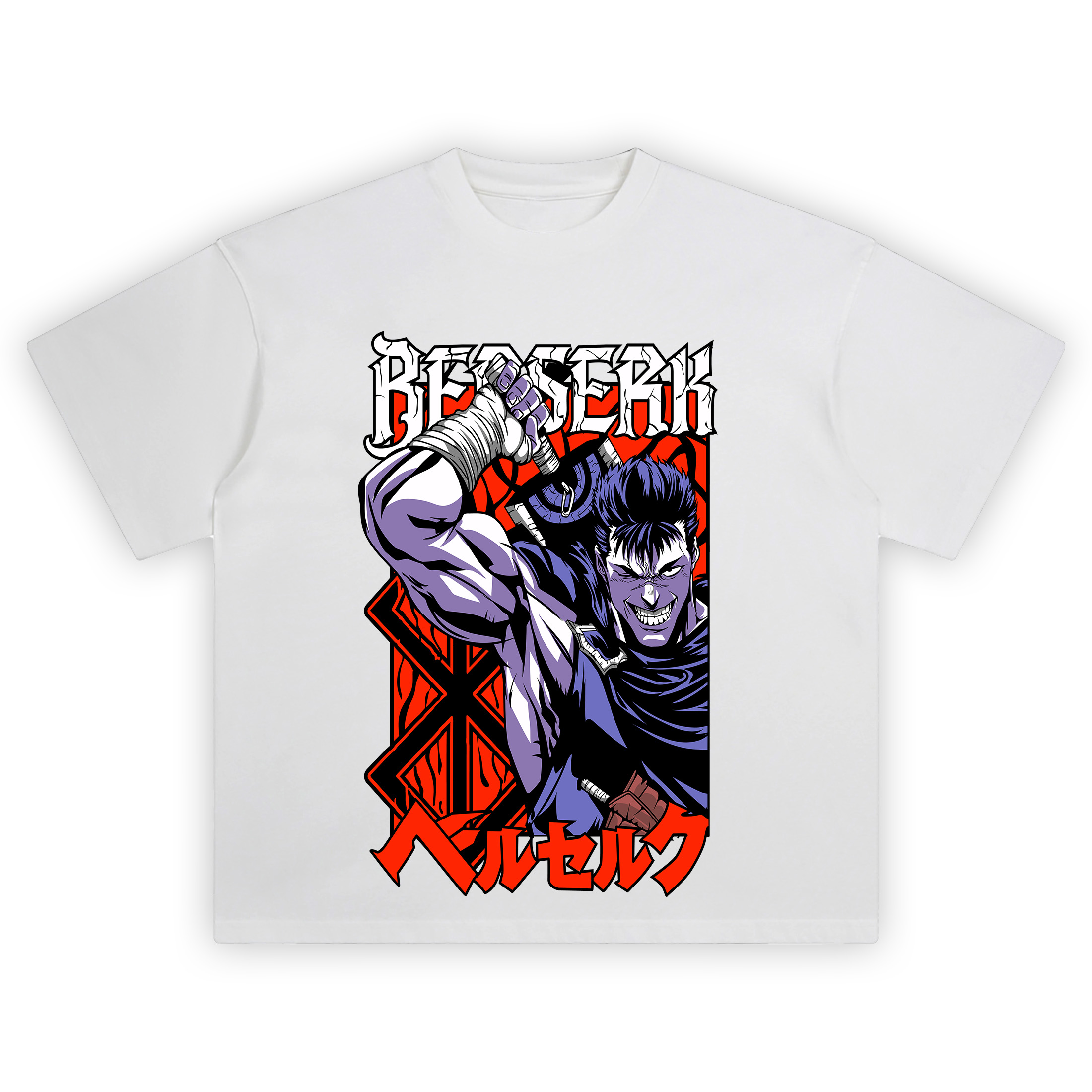 The Berserk Guts Brand of Sacrifice Tee – Savage Smirk Edition captures the raw rage and resilience of the Black Swordsman in one striking panel-style design. Featuring Guts mid-battle, sword raised high, and that iconic wild-eyed smirk—this graphic is a tribute to the madness of revenge and the will to survive.