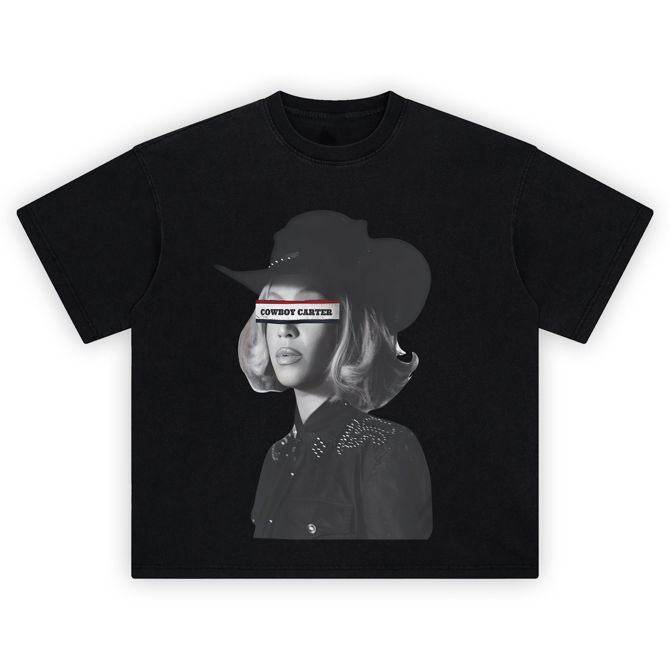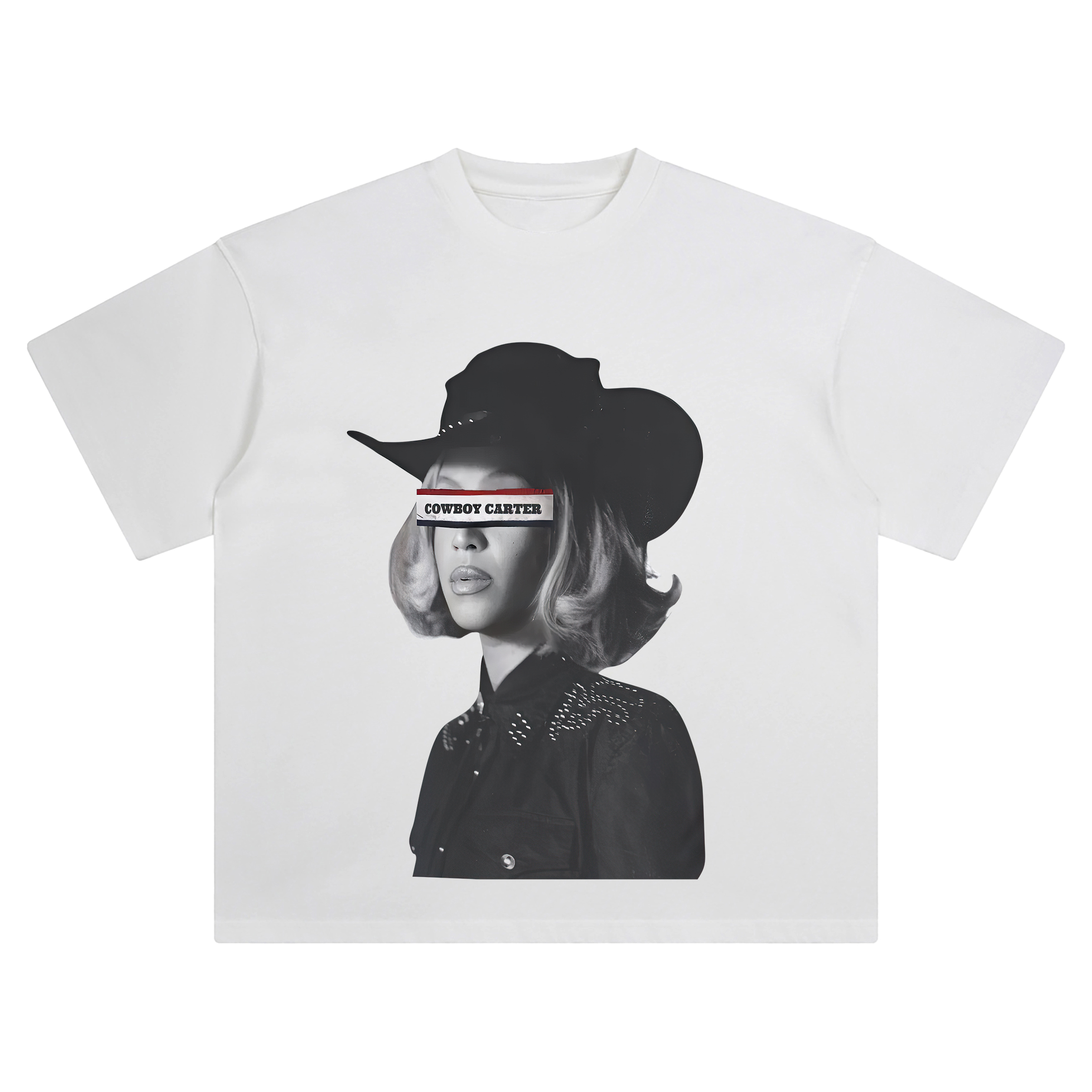 The Beyoncé Cowboy Carter Western Censor Bar Shirt delivers a bold, rebellious nod to the mystery and magnetism of Beyoncé’s Cowboy Carter persona. This monochrome portrait features Beyoncé in a classic Western look—wide-brim hat, bedazzled shirt—exuding quiet dominance and retro cool.