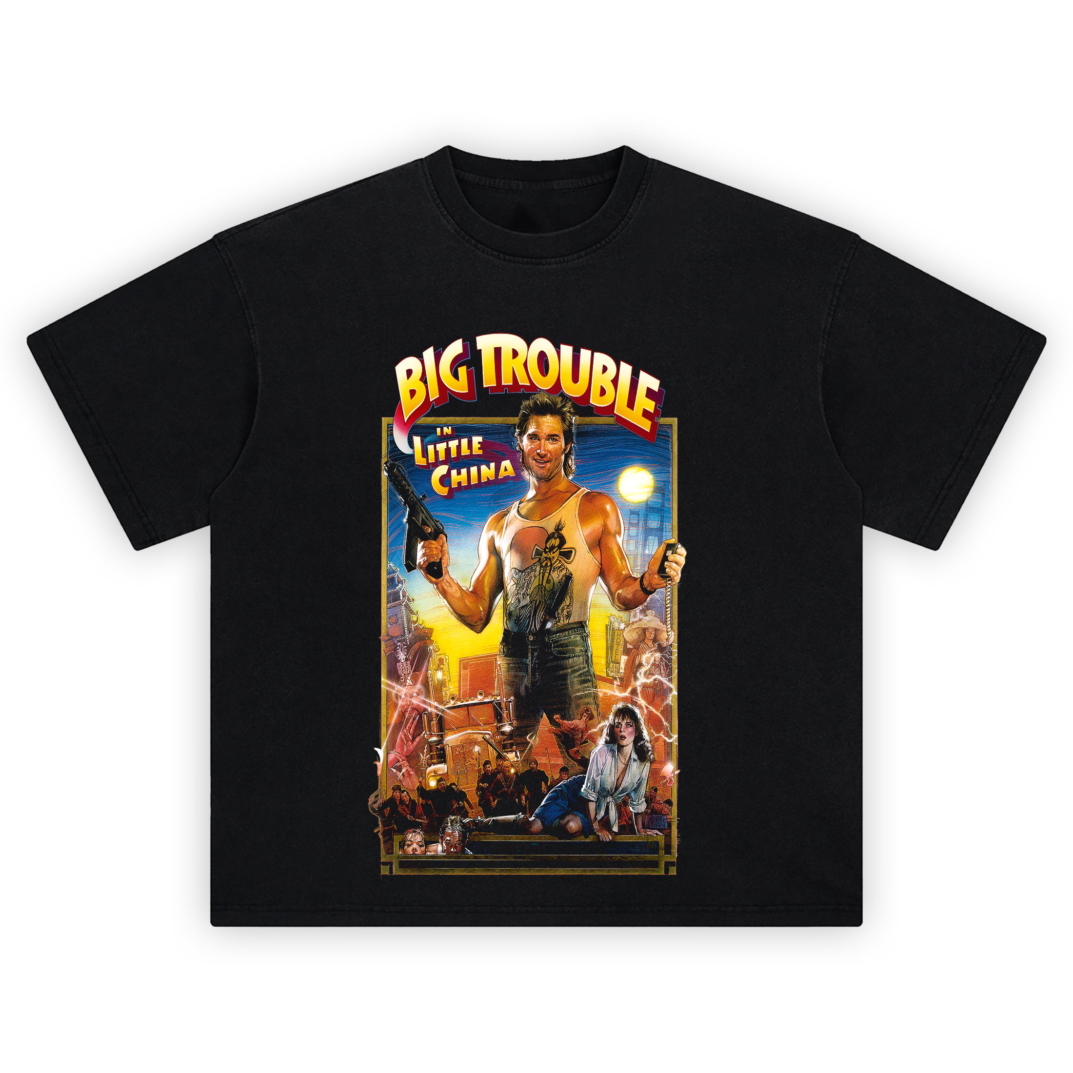 When you’re in over your head, all you need is confidence, a tank top, and a little trouble. Channel your inner Jack Burton with the Big Trouble in Little China Jack Burton Tank T Shirt โ a wild tribute to John Carpenterโs cult classic action-comedy. Featuring a bold print of Jack front and center, this tee captures the chaos of Lo Panโs mystical underworld, complete with lightning, kung fu warriors, and one hell of a semi-truck.