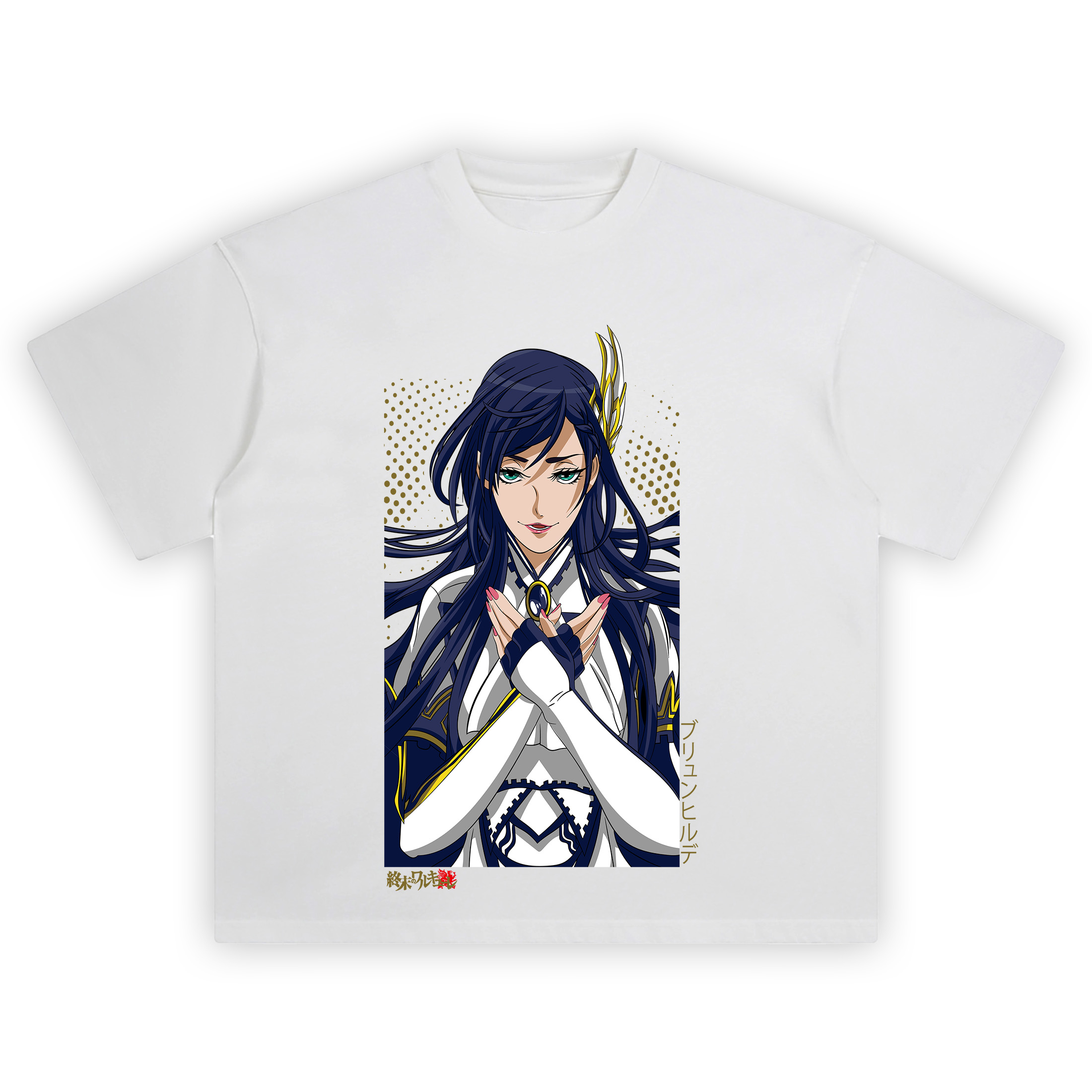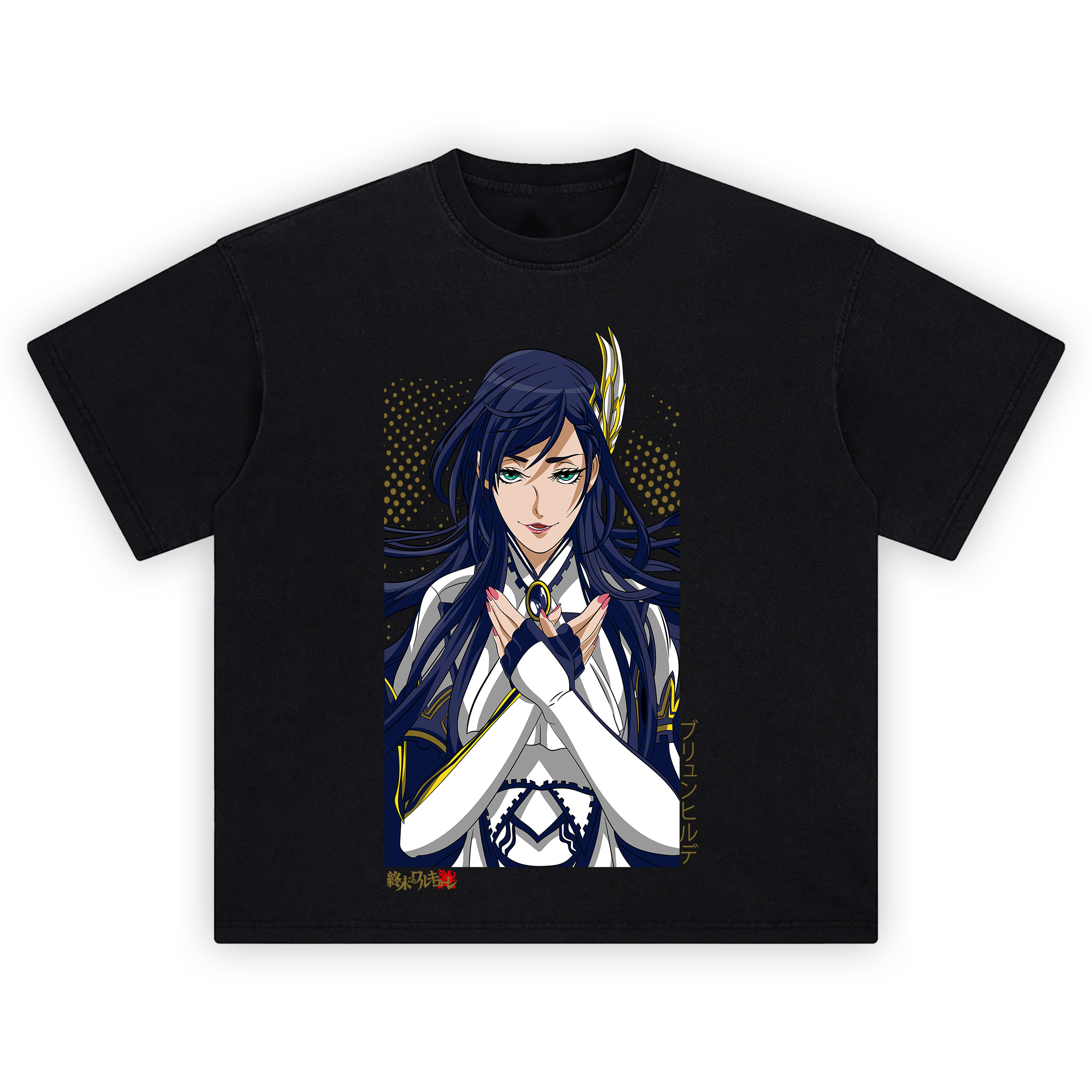 The Brunhilde Anime Shirt serves regal energy with a crisp vector portrait framed like a character poster. Center stage, a blue-haired warrior crosses her hands at the chest, fingers tipped in pink, clasping a dark oval gem set in a gold trim. Her green eyes and confident smile lock the vibe while a winged headdress shines at the temple. The palette stays clean—navy and white armor panels with sharp gold accents—so the silhouette reads instantly. Behind her, a dotted gold gradient arcs across a black backdrop, adding depth without stealing focus. A vertical katakana column rides the right border and a small red-stamped logo anchors the lower corner, giving the Brunhilde Anime Shirt that official poster feel. Flowing hair ribbons and seam details keep the lines dynamic, but the composition stays tidy and wearable. This is pure gallery-grade anime styling: thick inks, flat tones, and a tight frame that pops with jackets or stands alone with cargos. Nostalgia hits in the confident heroine pose and the classic border layout. Pull on the Brunhilde Anime Shirt when you want high-fantasy drip with streetwear bite—elegant, composed, and low-key lethal.