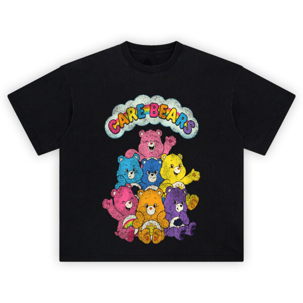 Care Bears Graphic Tee graphic showing an arched “CARE BEARS” rainbow cloud logo above a stacked group of colorful Care Bears with visible belly symbols on a black t-shirt.