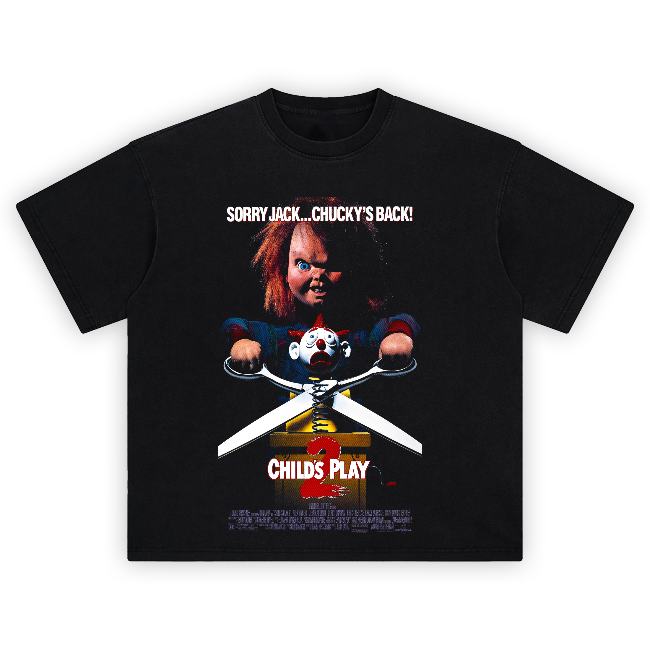 The Childs Play 2 Shirt slices right into the horror legacy with a chilling image of Chucky in one of his most iconic moments. With a sinister grin and a pair of oversized scissors, this design screams 90s horror nostalgia and captures the twisted tone of the second film in the franchise.