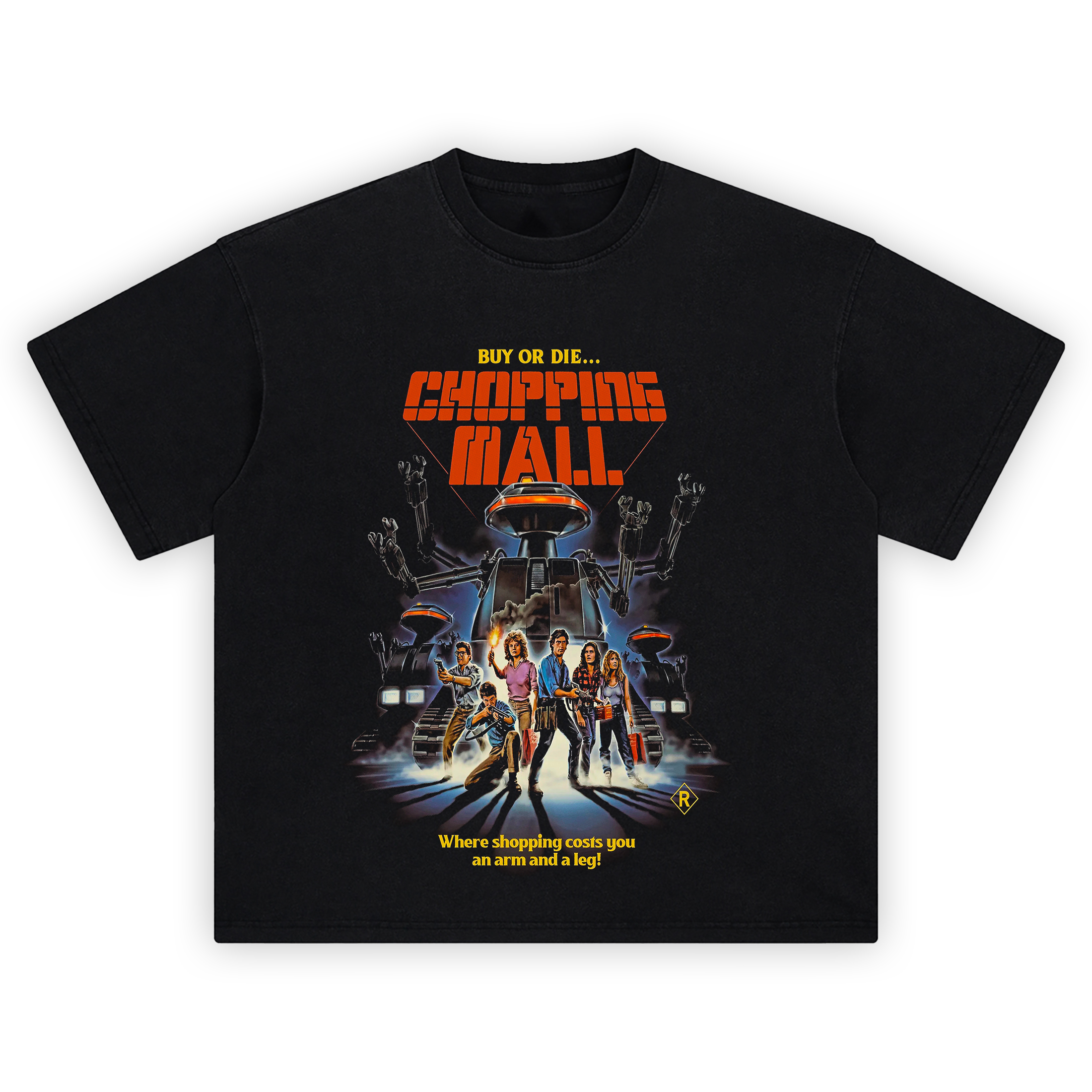 The Chopping Mall Shirt brings the cult classic mayhem of 1986 straight to your wardrobe. Featuring menacing killer security robots and the terrified survivors beneath their glowing eyes, this design captures the outrageous, over-the-top energy of a film where shopping turns deadly.