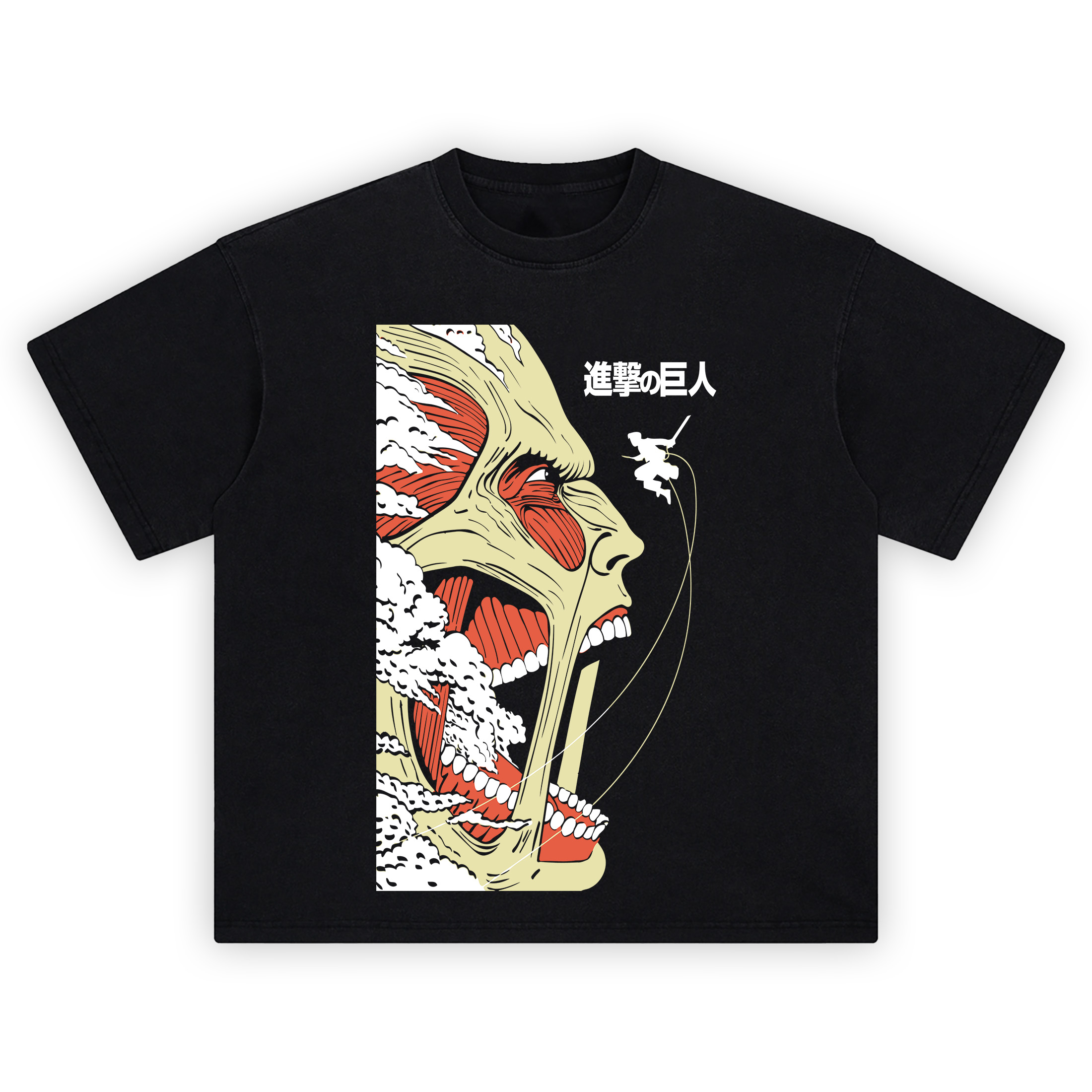 The Colossal Titan Roar Shirt captures that oh-no moment in a clean, poster-style vector. A massive side profile fills the tee—bone-yellow skull plates stretched over red sinew, teeth bared, and the mouth blasting clouds of steam that curl across the frame. Up top, bold Japanese kanji anchors the scene like a title card. To the right, a tiny soldier silhouette rockets in on ODM gear, cables whipping in pale arcs that slice through the black background and point straight into the titan’s jaws. The composition is ruthless: left-heavy titan face, right-side negative space for the swing, and crisp contour lines that carve the brow, eye bag, and nose with manga accuracy. Minimal palette hits hard—bone, scarlet muscle, stark white teeth and steam—so every detail reads from a distance. No clutter, just impact. Rock the Colossal Titan Roar Shirt with black cargos and a work jacket; the sweeping cables and kanji headline give your fit that street-poster energy. If you love bold profiles, kinetic diagonals, and scenes that feel snatched from a legendary panel, the Colossal Titan Roar Shirt is the piece that roars back.