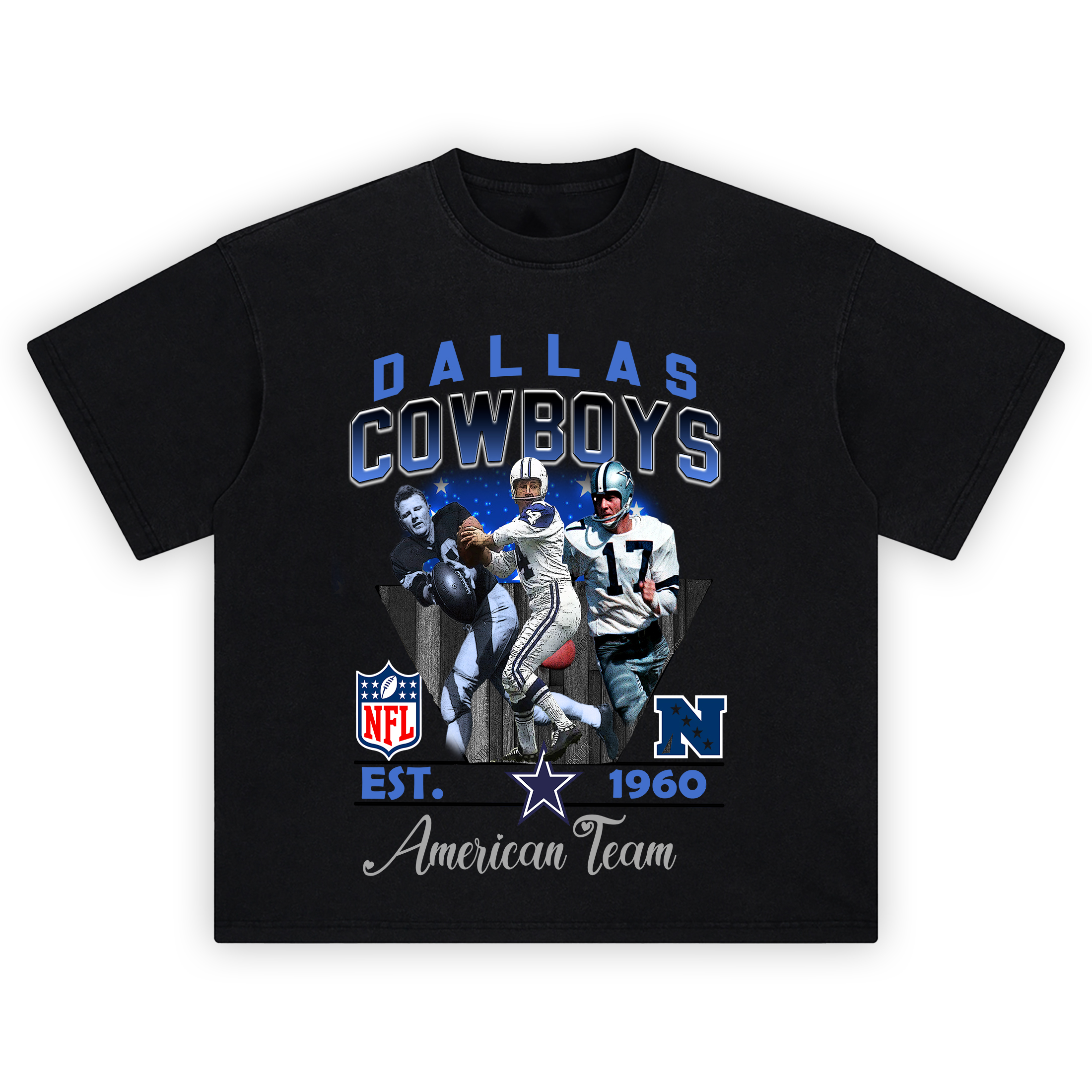 The Dallas Cowboys American Team T-shirt is a proud throwback to football royalty. Featuring a montage of classic Cowboys legends and a rich navy-and-silver palette, this shirt brings together decades of dominance with star-studded energy. From the NFL shield to the “Est. 1960” mark, this tee is more than merch—it’s a legacy stitched in cotton.