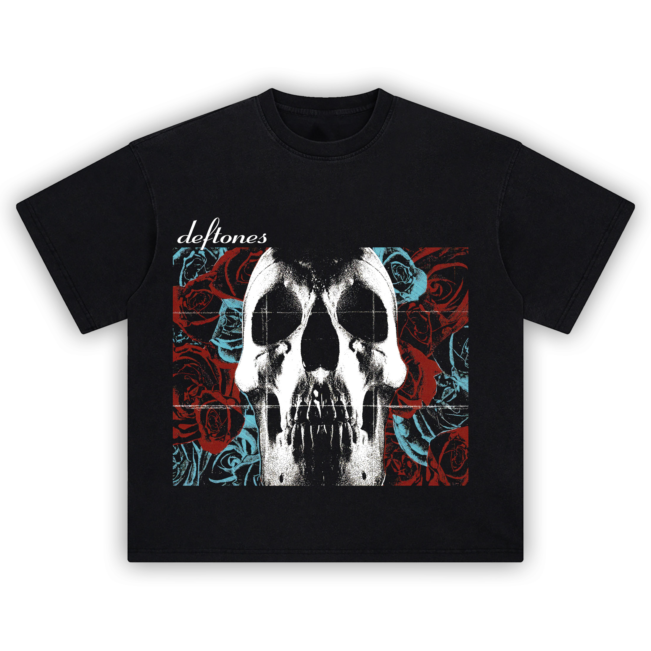 The Deftones Skull and Roses Tee is a brutalist dreamscape—equal parts beauty, decay, and distortion. A stark, grunge-textured skull looms large, flanked by blood-red and ice-blue roses that feel as delicate as they are deadly. The band’s name floats in minimalist script above, like a whisper before a scream.