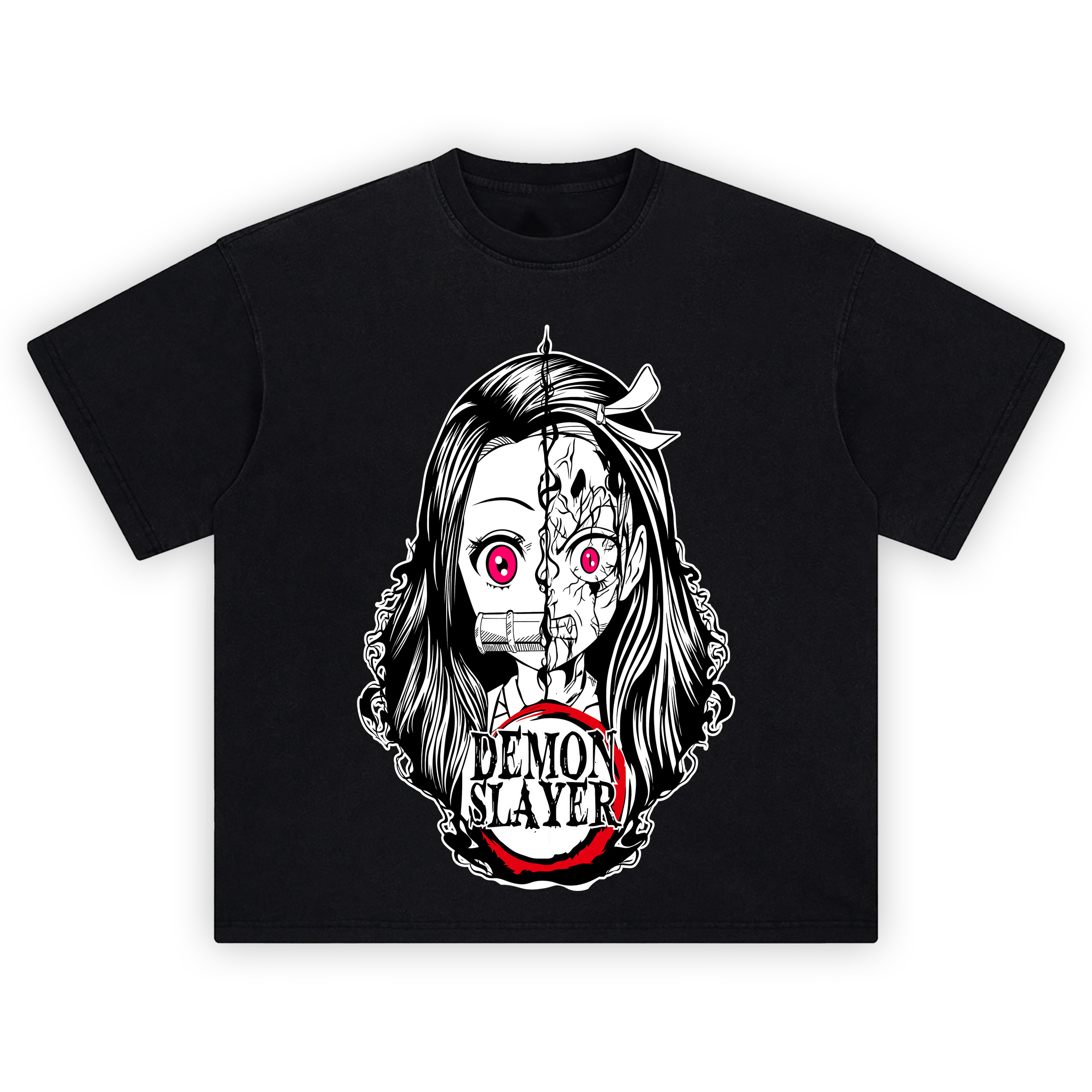 The left half of the shirt art showcases Nezuko’s calm, human form—wide pink eyes, bamboo muzzle, and flowing hair with her signature ribbon. The right half bursts with intensity, revealing her demonic side, veins creeping across her face and eyes glowing with fury. The black and white design is pierced by vibrant pink and red accents, adding emotional intensity and a fierce pop of contrast.