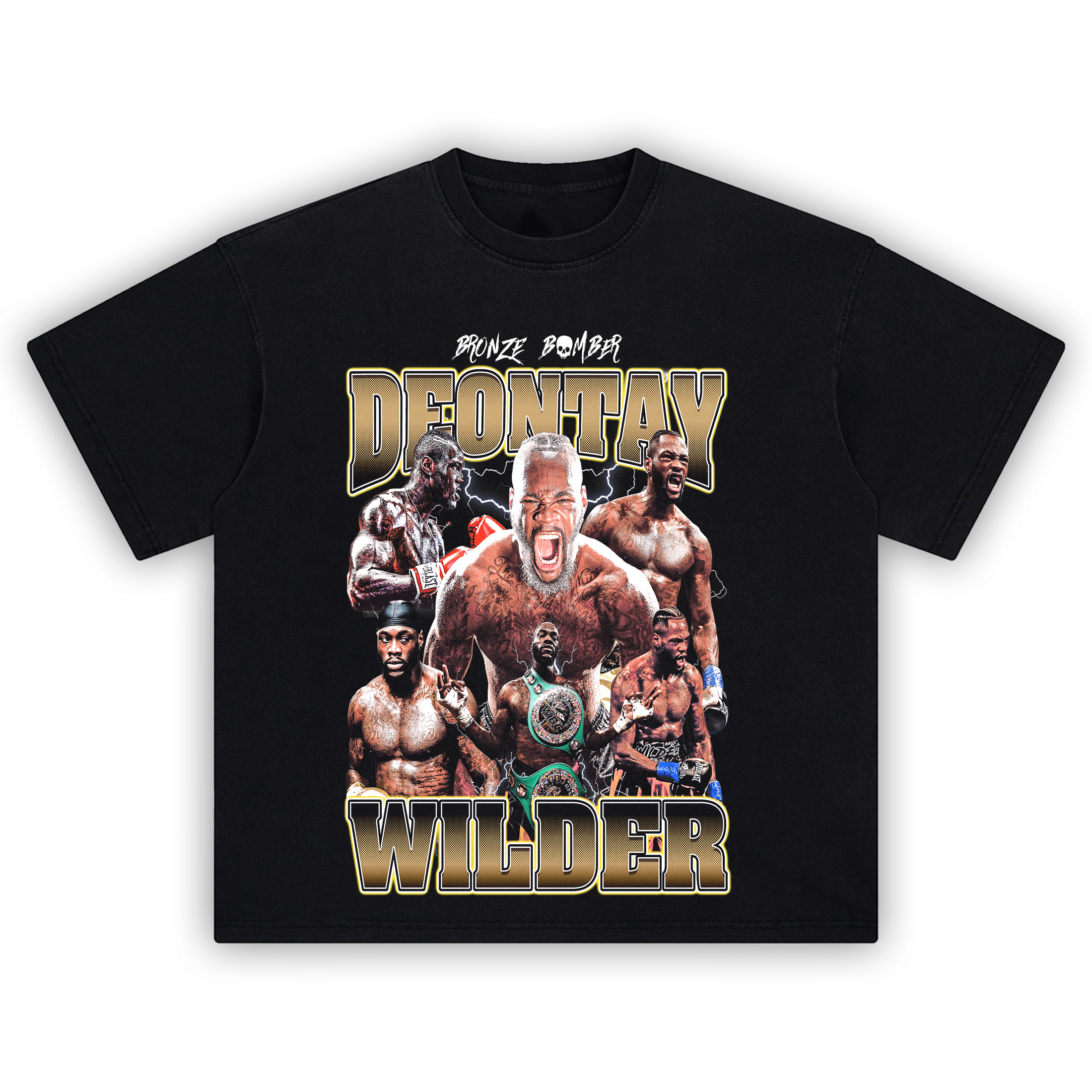 • DTG-printed Deontay Wilder graphic collage with electrifying ring energy