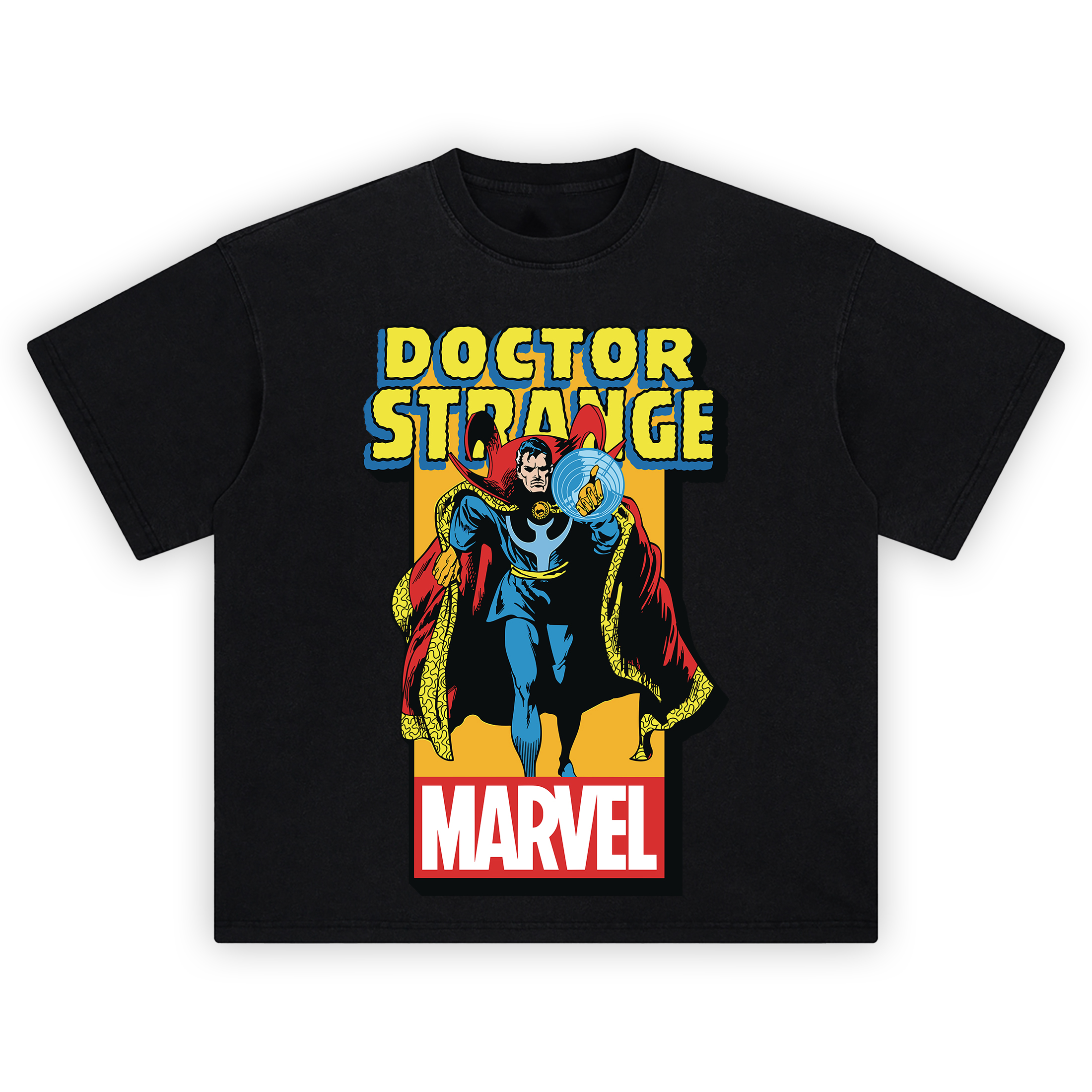 The Doctor Strange Classic Marvel Graphic T-shirt casts a spell straight from the vintage vault. With a bold yellow backdrop and oversized block lettering, this tee conjures the Sorcerer Supreme in full 70s-era glory—flowing red Cloak of Levitation, Eye of Agamotto blazing, and mystical sigils spinning from his fingers. The print bursts with that comic-book texture and grain, immortalized in high-resolution DTG that keeps every swirl sharp and saturated.