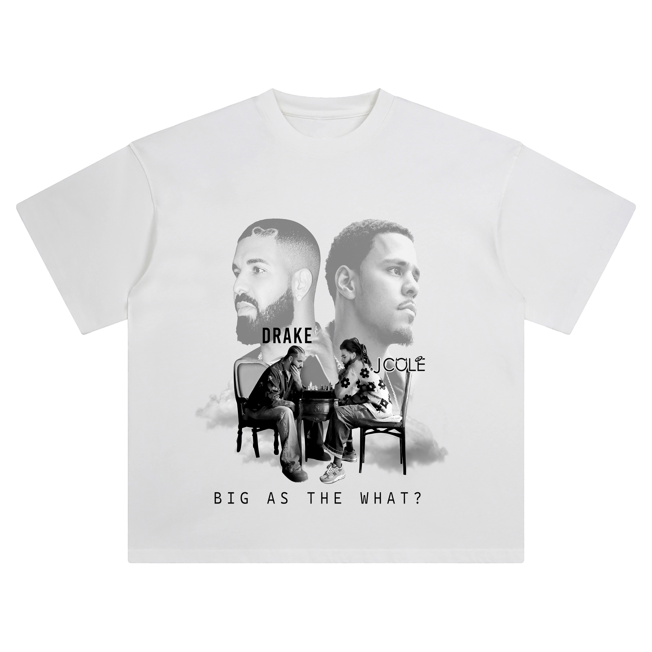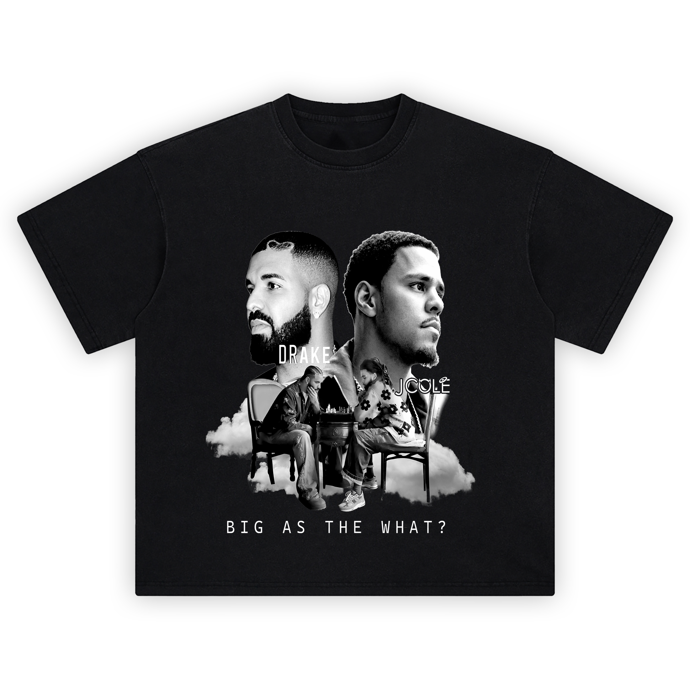 The Drake J Cole Chess T-Shirt is a moment frozen in strategy—two lyrical giants facing off in black-and-white brilliance. This tee blends power and poise, showing Drake and J Cole locked in a chess match that symbolizes more than just the game. Floating on clouds, their larger-than-life portraits hover above the scene, gazing out with intensity. The phrase “Big As The What?” anchors the design with mystery and energy. Printed in DTG with smooth gradients and sharp contrast, this shirt plays like an album cover come to life.