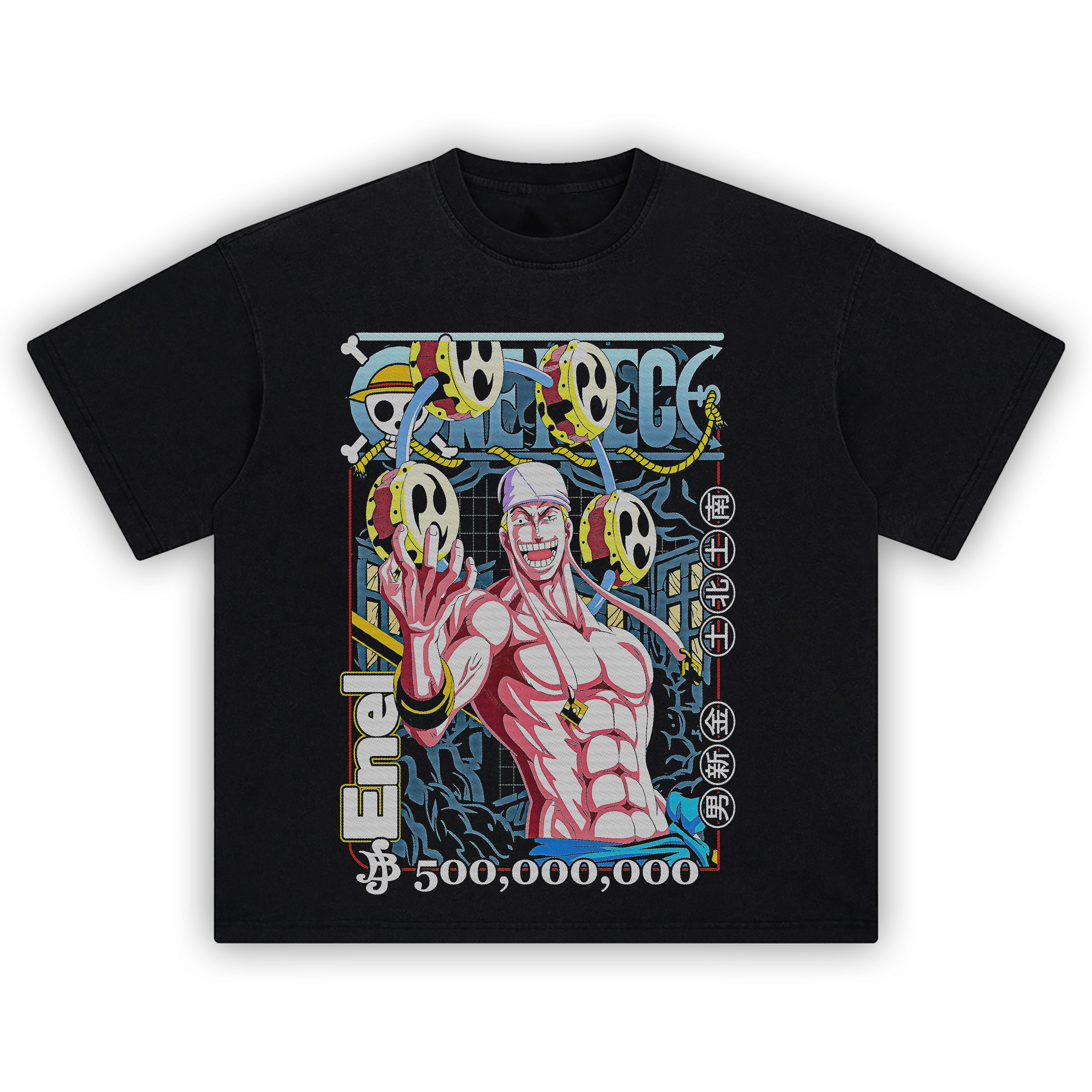 Unleash divine judgment in the Enel Bounty Tee, a shocking tribute to the self-proclaimed God of Skypiea. Clad in lightning and crowned in madness, Enel electrifies this graphic T-shirt with his imposing 500,000,000 bounty and god-tier attitude.