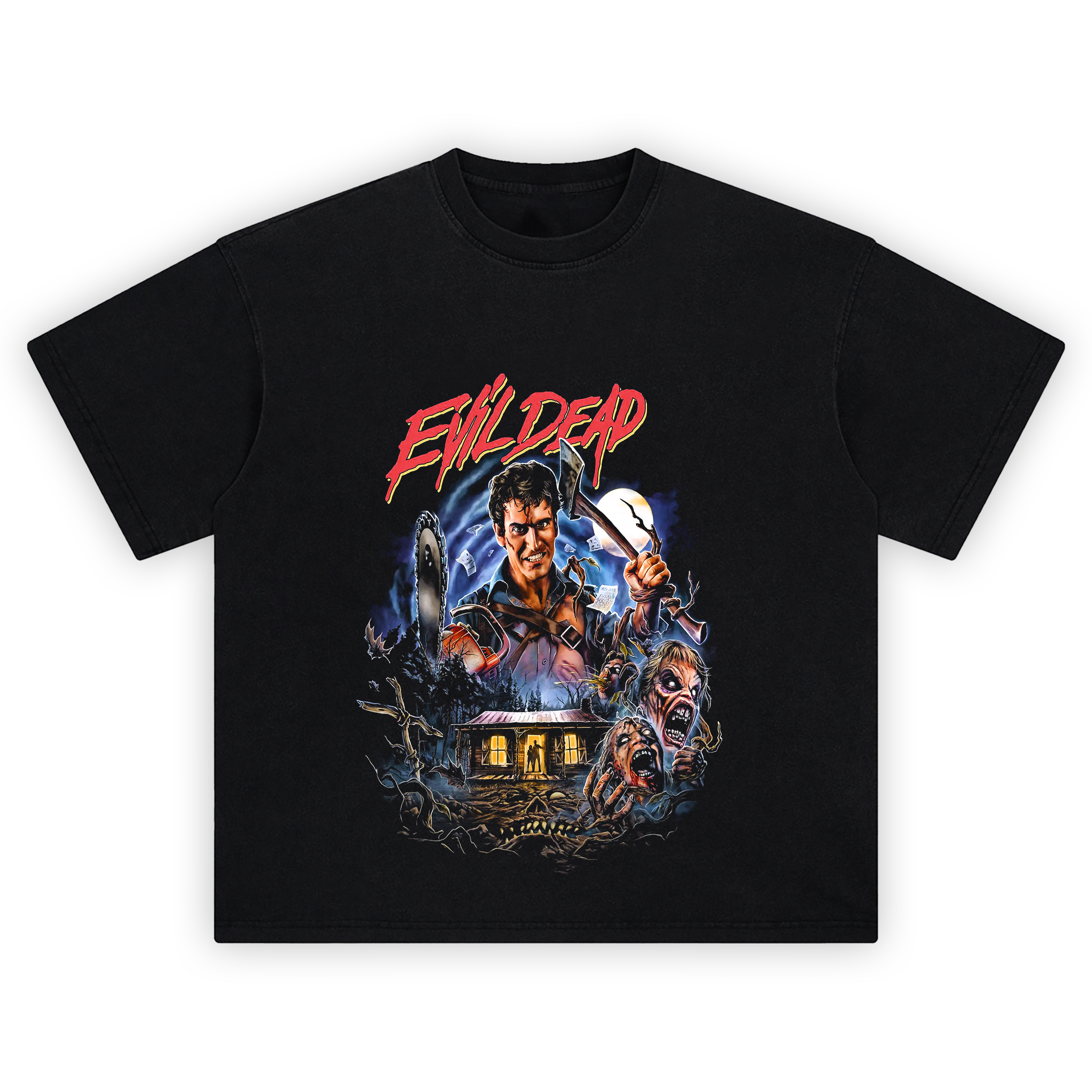 Unleash the undead with this Evil Dead Graphic T-Shirt, a brutal tribute to Sam Raimi’s horror masterpiece that started it all. Featuring Ash Williams with his axe and chainsaw in a forest of twisted trees and Deadites, this design captures the chaos, terror, and iconic imagery that turned Evil Dead into a cult sensation.