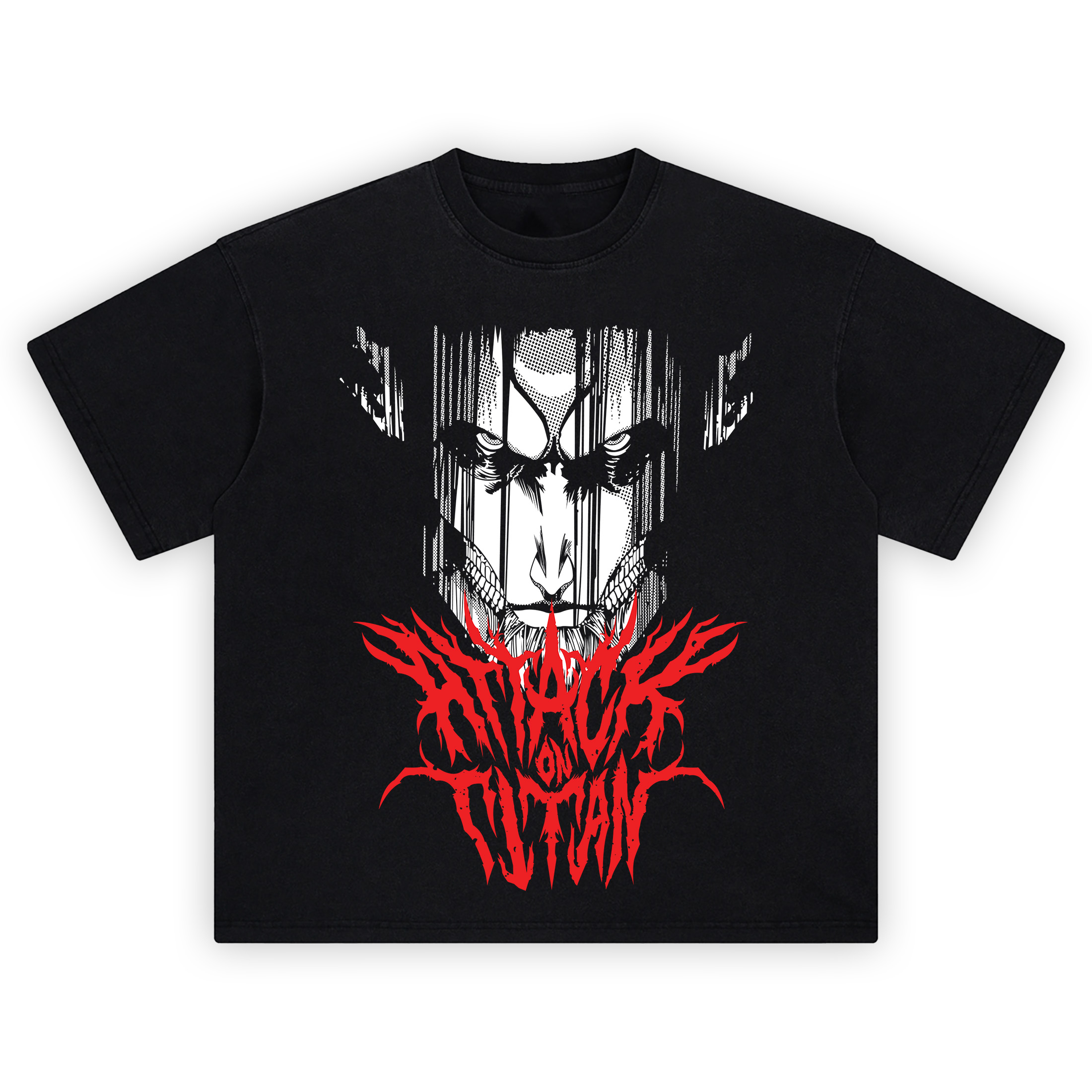 The Founding Titan Metal Logo Shirt goes feral with a stark black-and-white face staring straight through you—heavy inks, vertical drip lines, and those skeletal cheek marks etched like cuts. It’s a full manga close-up, all shadow and grit, with cross-hatch dots that give the skin a raw, printed texture. Anchoring the layout, a blazing red wordmark explodes across the bottom in jagged, death-metal typography that literally reads “ATTACK ON TITAN,” spikes flaring outward like flames. The contrast slaps: white visage up top, inferno text below, everything locked in a tight poster composition. No background scenery—just menace and loud type—so the Founding Titan Metal Logo Shirt punches from across the room and rewards up-close looks with line weight, drip streaks, and the serrated edges of every letter. It’s that late-night fanscan vibe meets mosh-pit merch energy. Pair the Founding Titan Metal Logo Shirt with black cargos and chain accessories; throw on a denim or leather jacket and let the red logo blast from the hem. For anime heads who love their tees with a little chaos and a lot of attitude, this design is pure wall-print heat you can wear.