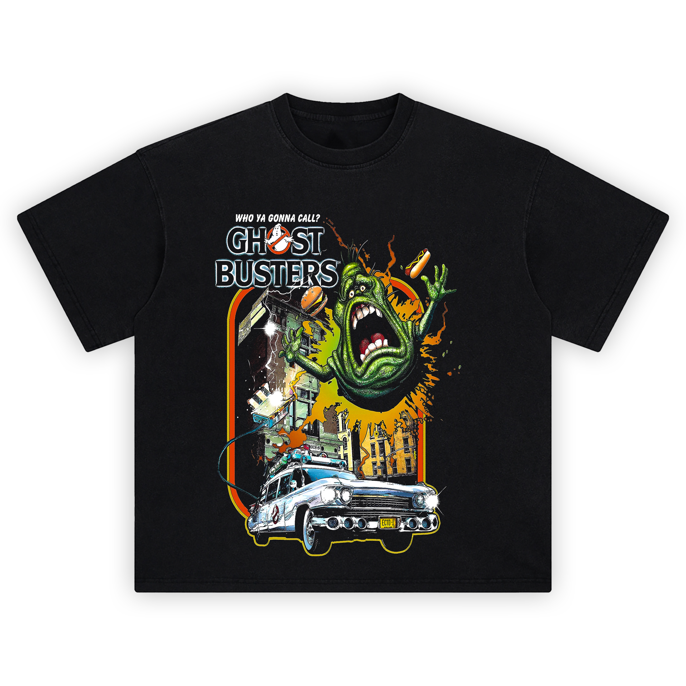 The Ghostbusters Slimer Shirt explodes with chaotic, cartoonish energy as Slimer tears through the city—mouth wide, junk food flying, and the Ecto-1 in hot pursuit. This design captures the quirky side of ghostbusting, celebrating the mischief and madness of the original 1984 classic with bold, retro comic-style artwork.