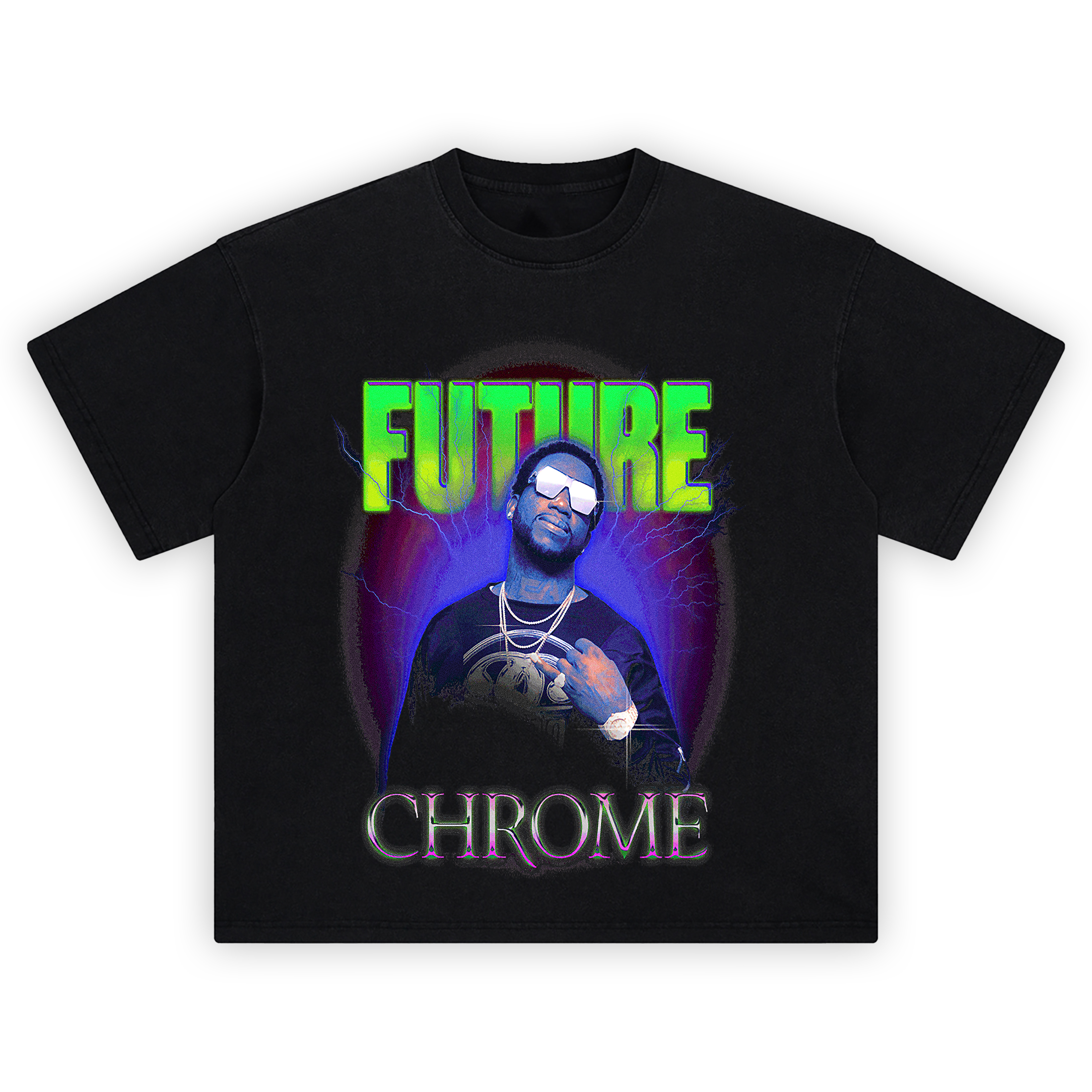 The Gucci Mane Chrome Lightning Tee fuses raw trap legacy with vibrant chrome aesthetics. Centered with a bold portrait of Gucci Mane in icy chains and mirrored shades, this tee crackles with neon energy, electrified by a stormy backdrop and glowing “FUTURE” and “CHROME” text.