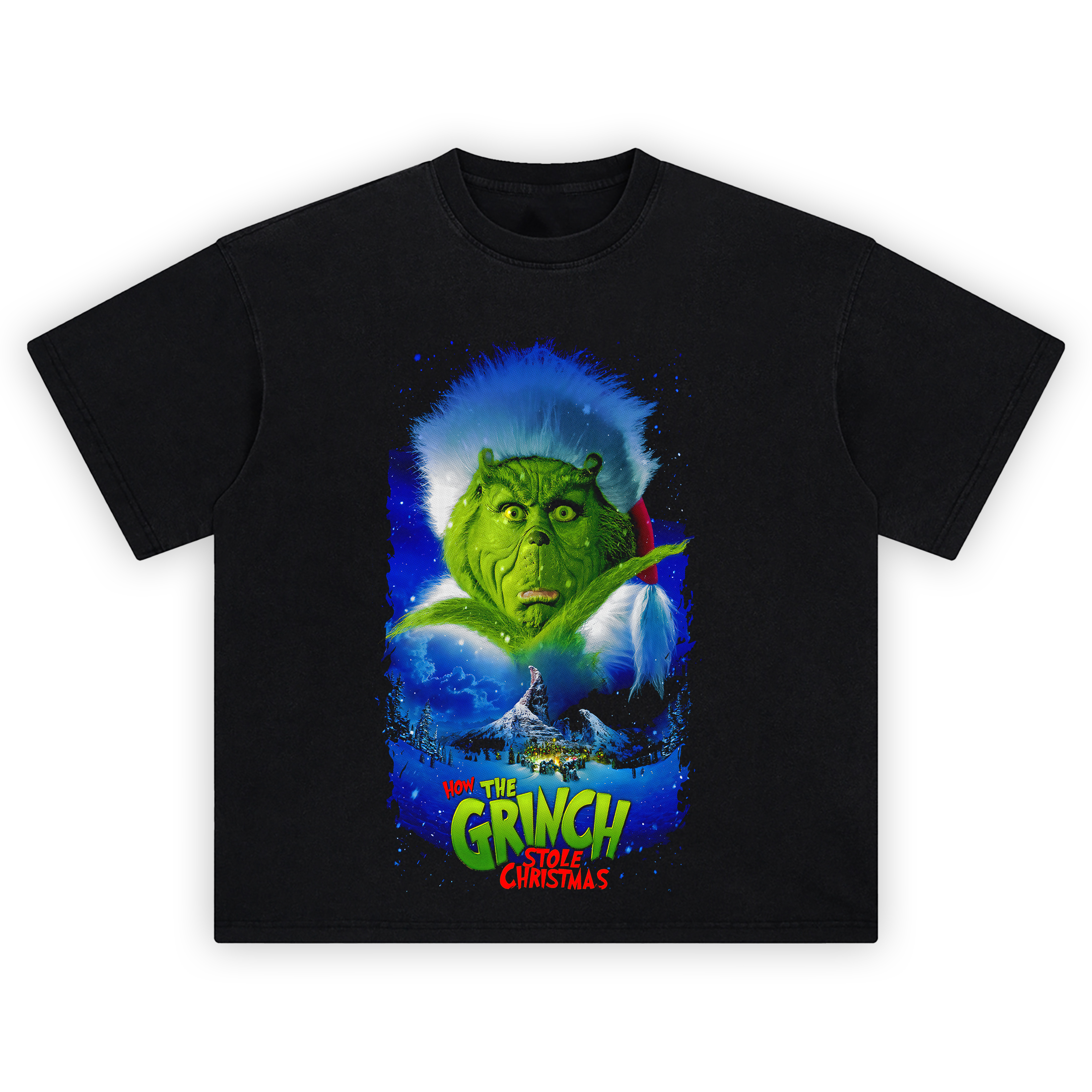 The design bursts with festive color, featuring the Grinch’s mischievous face peering through a flurry of blue winter skies, his Santa hat askew and fur blazing like tinsel. Below, Mount Crumpit towers over the twinkling lights of Whoville, reminding everyone exactly where all the stolen gifts almost ended up. Whether you’re a fan of Carrey’s manic magic or just someone who relates to holiday grumpiness — this tee delivers.