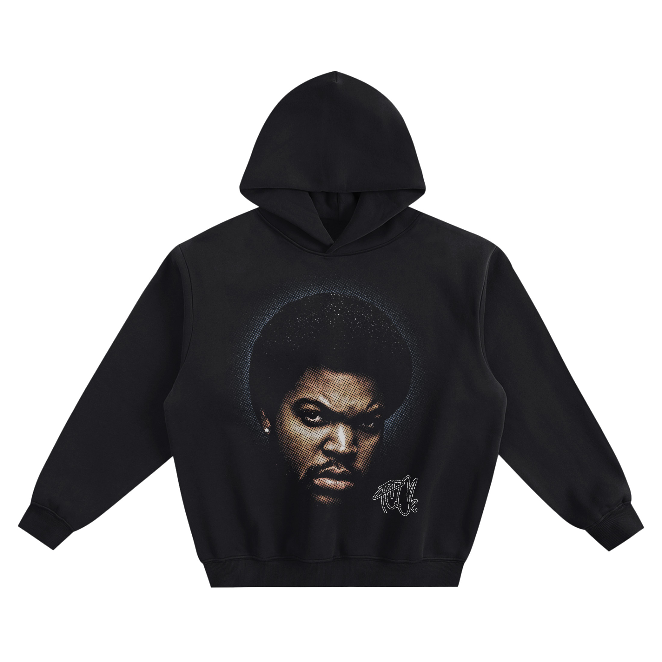 Make a bold, no-nonsense statement with the Ice Cube Big Face Hoodie—a front-graphic piece built around an instantly recognizable portrait. The artwork features a tight close-up of Ice Cube with a full afro, intense stare, and clean facial details that keep the focus locked on his expression. A soft, cool-toned glow frames the head against a deep black background, giving the portrait a dramatic, spotlight feel without adding extra elements.