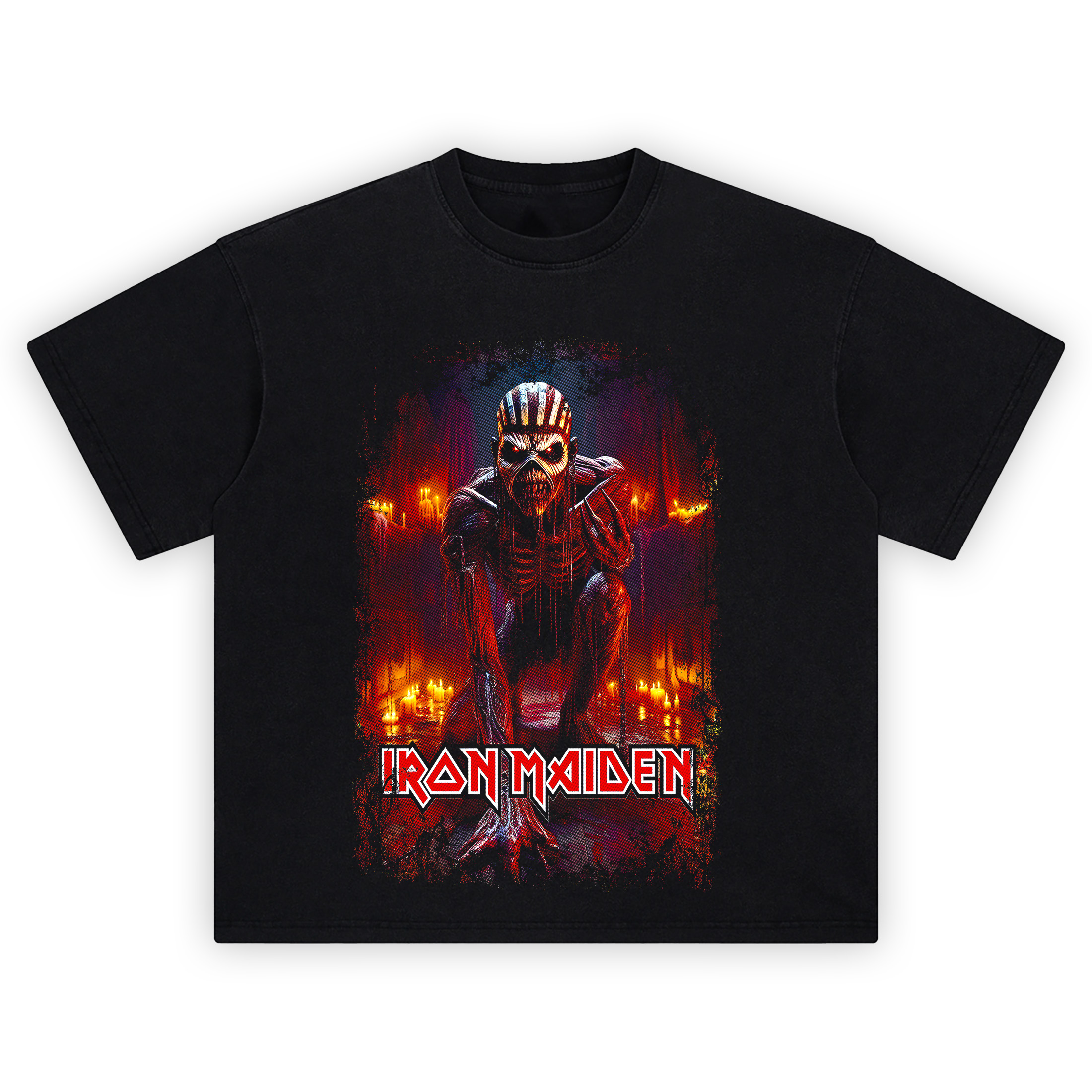 Printed on thick, soft cotton with an oversized silhouette, the Iron Maiden Candle Crypt T-shirt delivers the kind of heavy, durable feel that belongs in a mosh pit—or a mausoleum. Vivid DTG printing locks in the saturated reds and blackened edges, giving it that just-summoned-from-hell look. Turn off the lights. This one glows on its own.