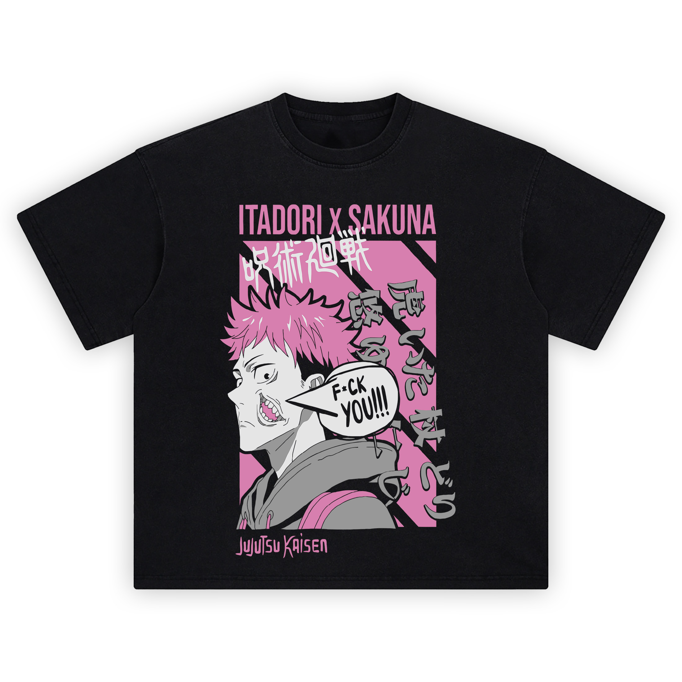 Turn your fit into a cursed poster with the Itadori x Sukuna shirt. The design hits like a manga splash page: bold “ITADORI x SAKUNA” header up top, layered white kanji streaking across diagonal pink panels, and Yuji side-profile in grayscale with cotton-candy hair and a sharp canine flashing. A huge speech bubble explodes from the frame with “F*CK YOU!!!” scrawled in black, giving the graphic that raw, rebellious energy only JJK can deliver. Grey Japanese characters tumble down the right side like graffiti, while “Jujutsu Kaisen” anchors the bottom in the same electric pink for a tight poster layout. Vector lines stay clean and chunky; shading leans cel-style, so the pink, black, and grey palette really slaps against dark fits. Rock the Itadori x Sukuna shirt with black cargos and silver accessories for a club-ready vibe, or layer under a zip hoodie so the speech bubble steals the spotlight. The asymmetrical composition, diagonal blocks, and stacked typography scream modern streetwear while keeping the anime core intact. If you’re team Yuji yet haunted by the King of Curses, the Itadori x Sukuna shirt bottles that inner back-and-forth with style and bite.