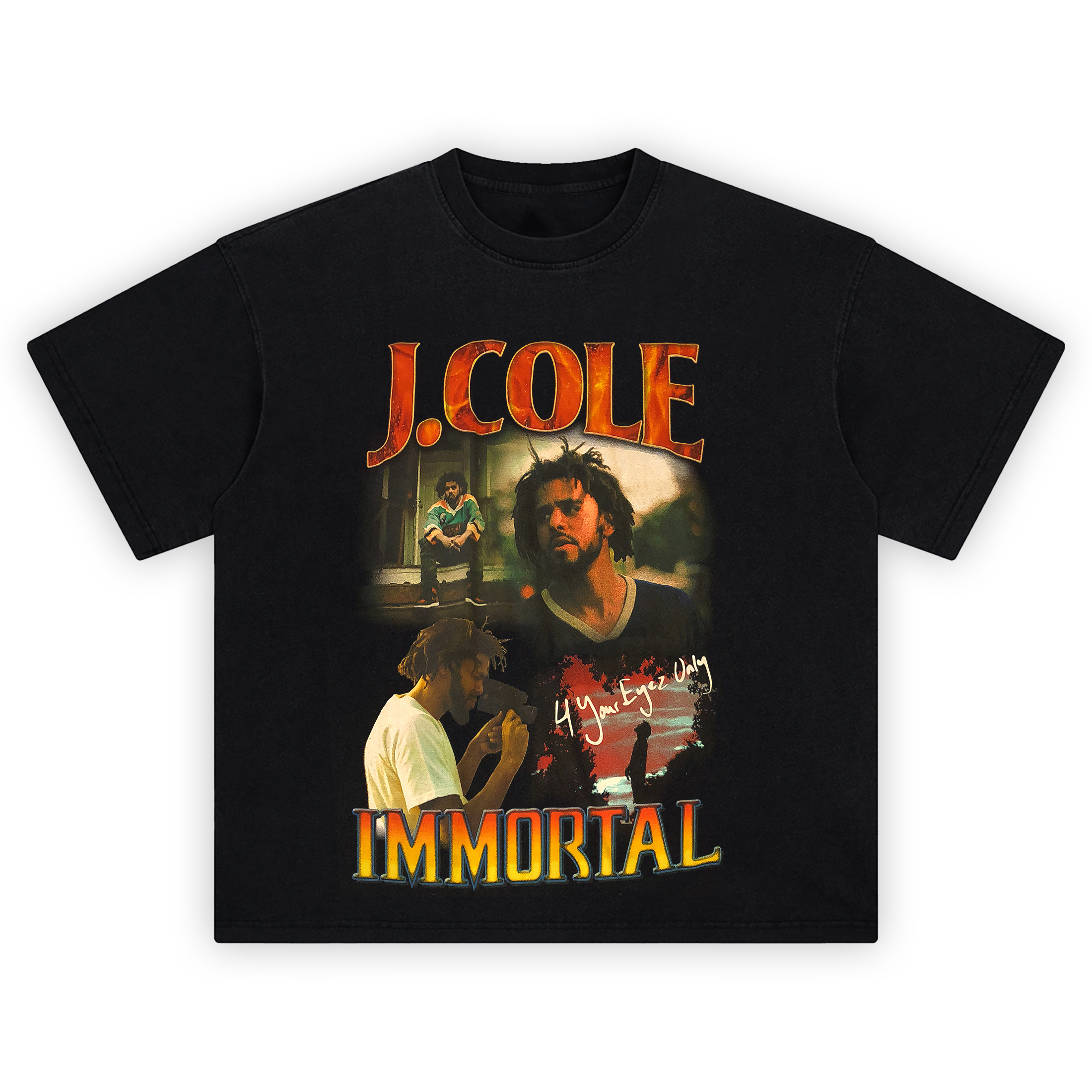 The J Cole Immortal T-Shirt is a visual dedication to truth, legacy, and lyrical soul. Featuring moody, film-like captures from the 4 Your Eyez Only era, this tee burns slow with introspection. A muted color palette wrapped in fiery overtones sets the stage, with Cole holding a camera, lost in thought, and walking alone into a red horizon. The bold โIMMORTALโ at the bottom anchors the design like a verse that hits deep. Printed in high-quality DTG, itโs textured, cinematic, and raw.
