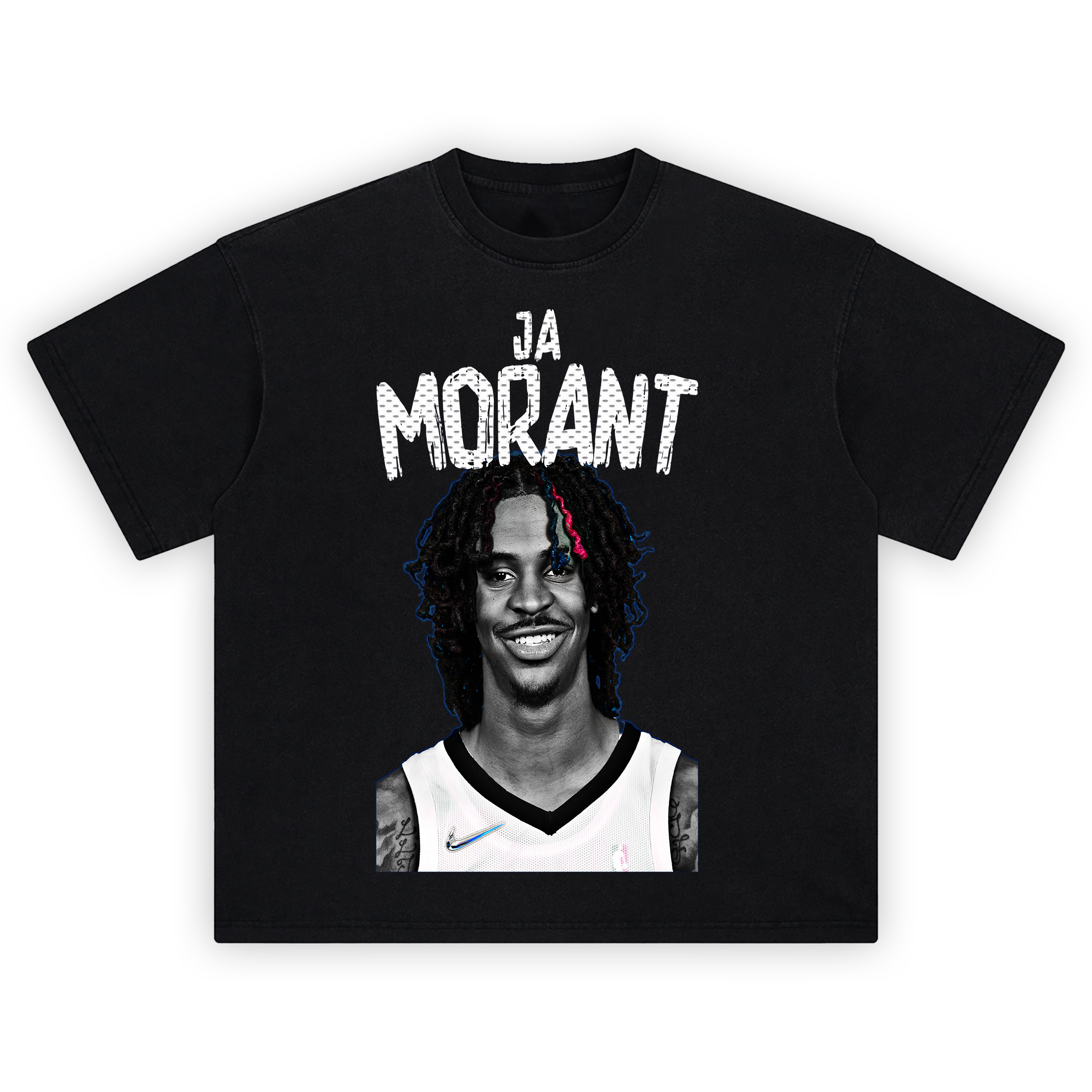 This monochrome masterpiece features a sharp close-up portrait of Morant centered beneath his name in textured white-out lettering. The design rides that perfect line between clean and chaoticโjust like Jaโs game. The slight edge-glow color streaks in his locs reflect the cityโs neon grit and the fire that runs through every drive, dunk, and staredown.
