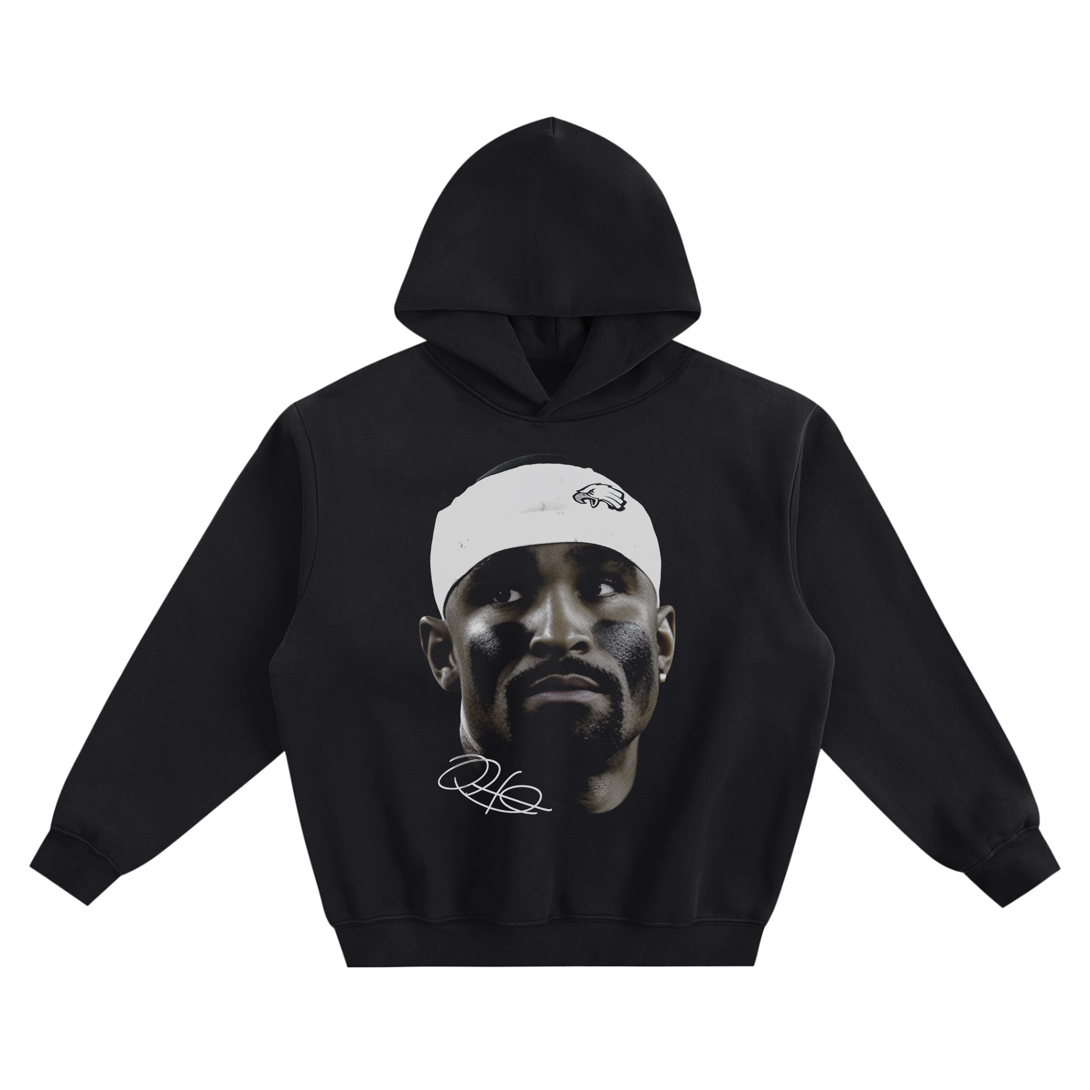 Locked in. Calm. Unshakable. The Jalen Hurts Big Face Hoodie puts a powerful close-up portrait front and center, capturing that game-day focus in one clean, high-impact image. The face fills the frame with a steady upward gaze, bold eye black across both cheeks, and a crisp white headband stamped with an eagle emblem—simple details that instantly set the tone.