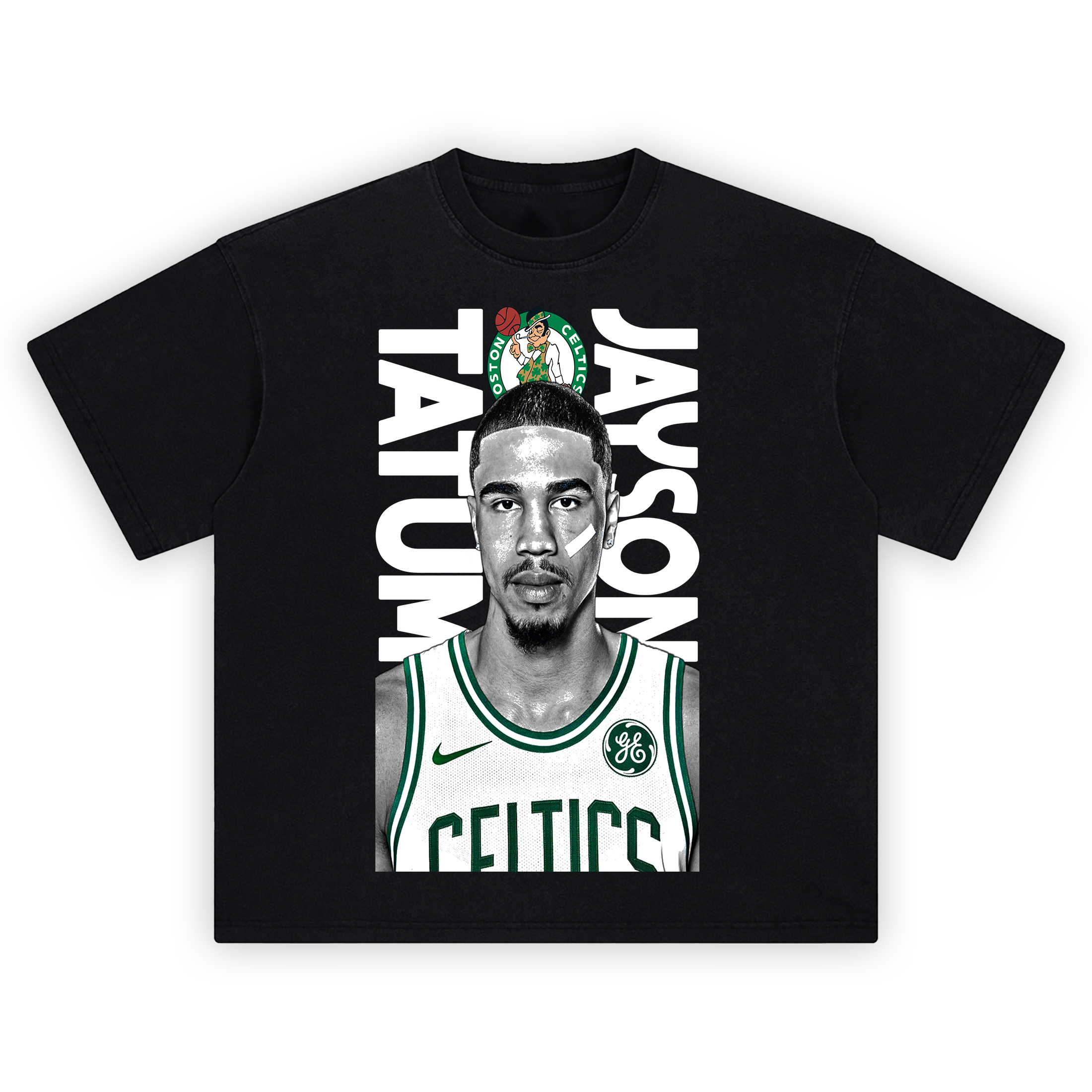 DTG-printed grayscale Tatum portrait + Celtics logo and vertical lettering