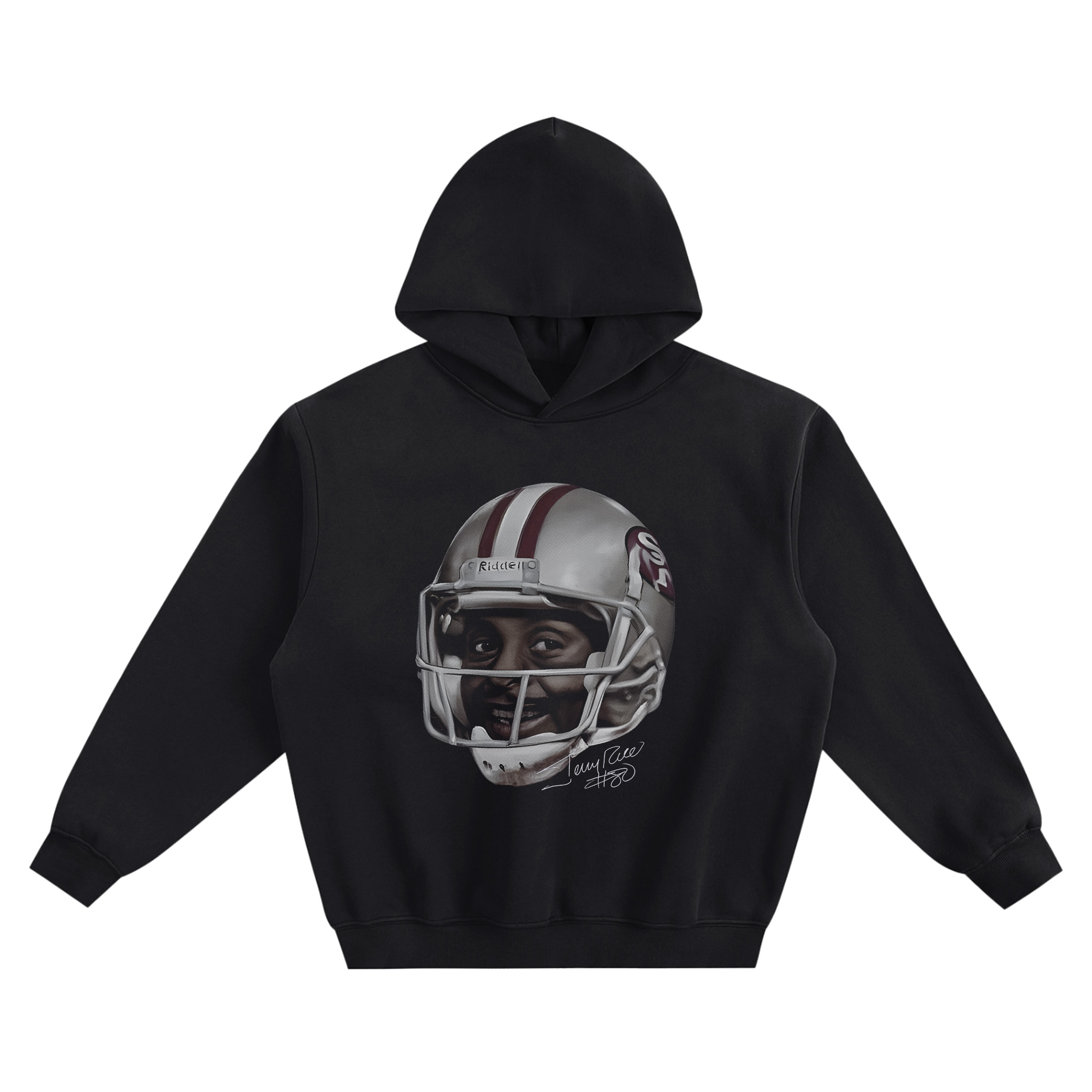 Make an all-time statement with the Jerry Rice Big Face Hoodie—a clean, focused portrait graphic built around instant recognition. The front design features a close-up headshot of Jerry Rice inside a silver football helmet, framed tight so the face fills the center of the piece. Details in the helmet stand out, including the red striping, the “SF” logo on the side, and the facemask bars crossing the lower half of the portrait. A small “Riddell” mark is visible near the top of the helmet, adding to the authentic game-day look of the artwork.