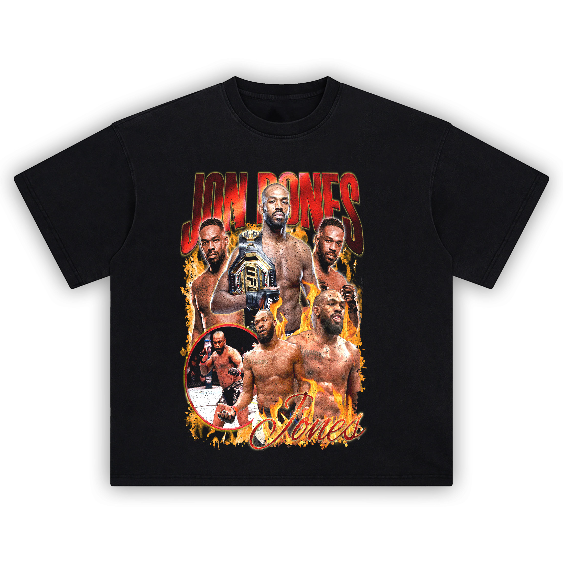 Printed with ultra-crisp DTG art, the design features a blazing collage of Jon Jones through the years—from his early domination to heavyweight reign. If you’re repping greatness, this one’s non-negotiable.