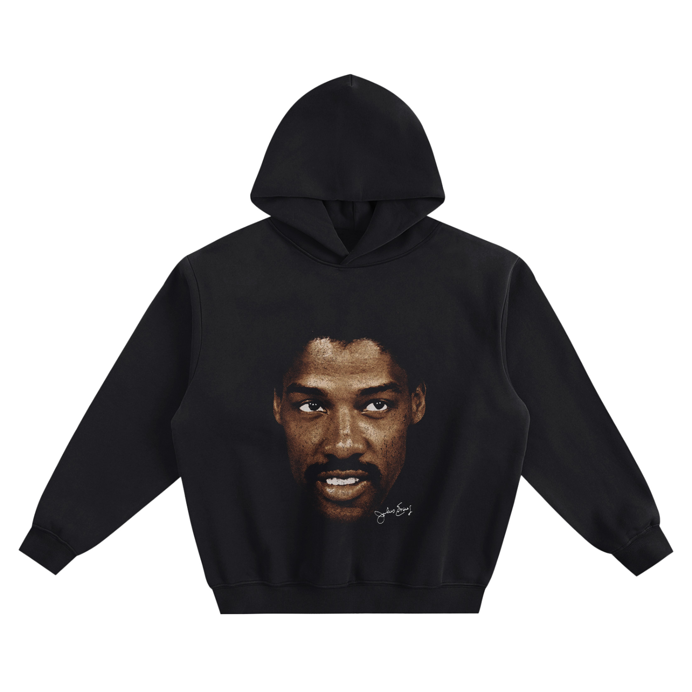 Make a statement with the Julius Erving Big Face Hoodie—a bold portrait graphic built around pure presence. The front design features a tight, centered close-up of Julius Erving’s face set against a black background, framed so the focus stays on his expression, eyes, and iconic look. The portrait carries warm, natural tones with deep shadows, giving the image a strong, high-contrast impact that reads instantly from a distance.