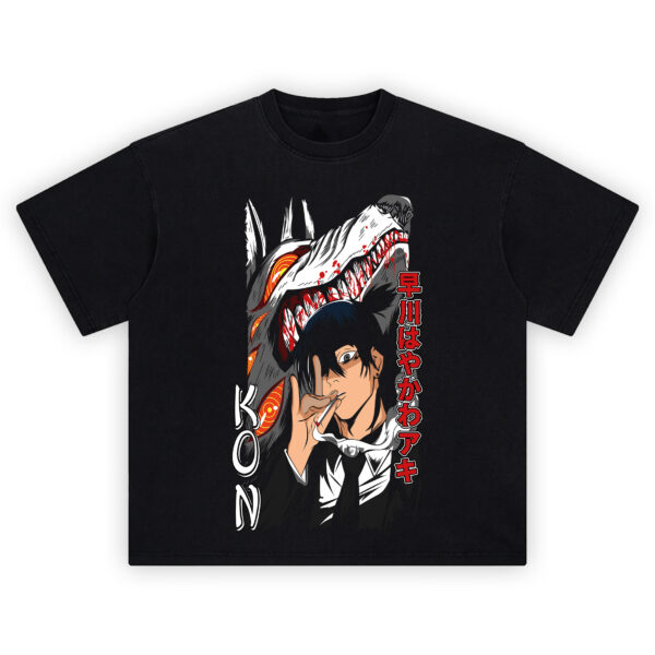 Step into the shadowy world of Chainsaw Man with the Kishibe & Kon Devil Contract T Shirt—a sinister tribute to the most seasoned Devil Hunter and his brutal hound of destruction. This graphic captures the cold-blooded calm of Kishibe mid-summon, paired with the demonic, fang-dripping ferocity of Kon emerging from behind, eyes blazing and jaws open in a violent snarl.
