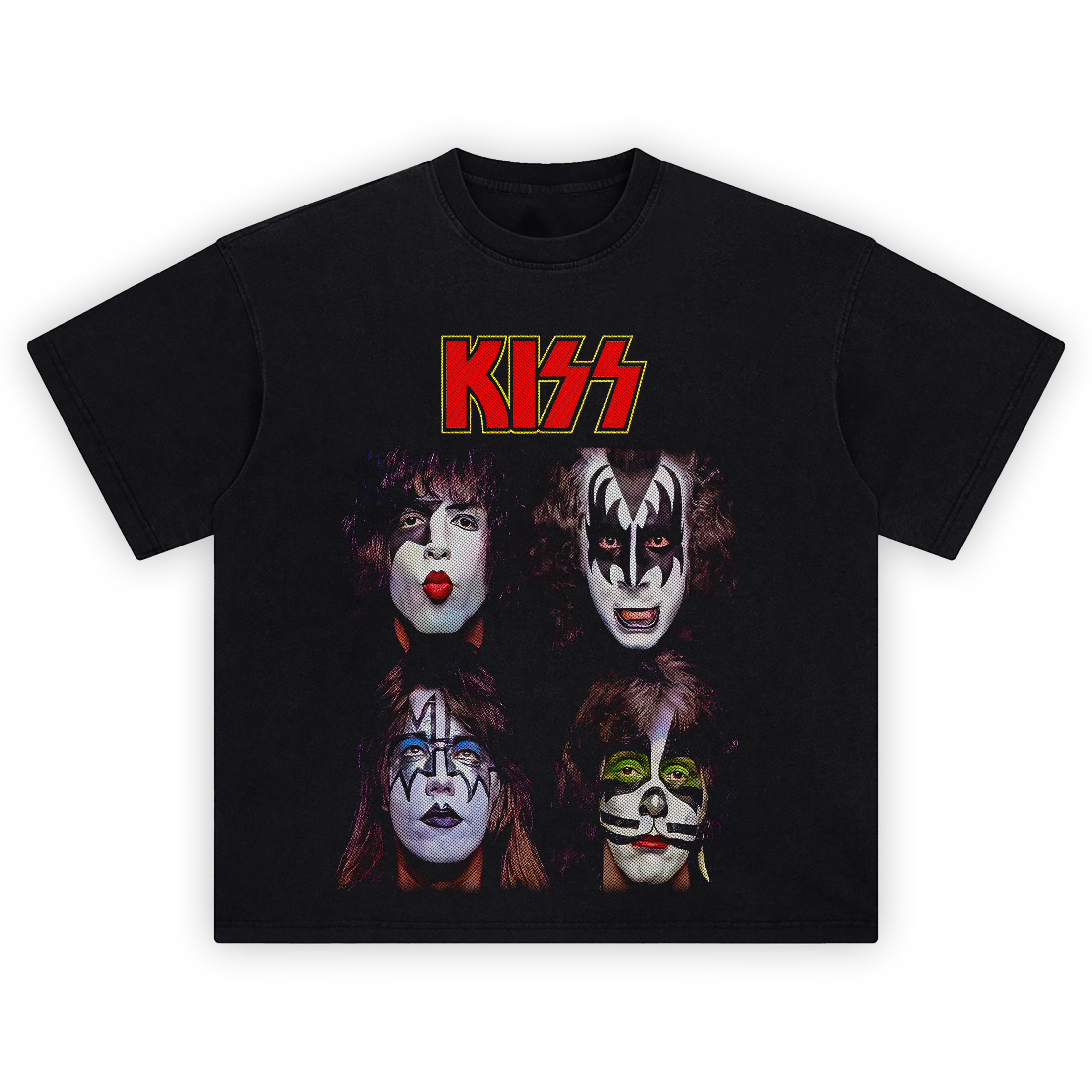 Loud, proud, and face-painted forever—this KISS Band Tee brings the thunder of glam rock to your closet with an electrifying design that honors the legendary foursome. Featuring the iconic makeup-clad portraits of Gene, Paul, Ace, and Peter in their classic lineup, this shirt is a full-volume throwback to the era of platform boots and pyrotechnic shows.