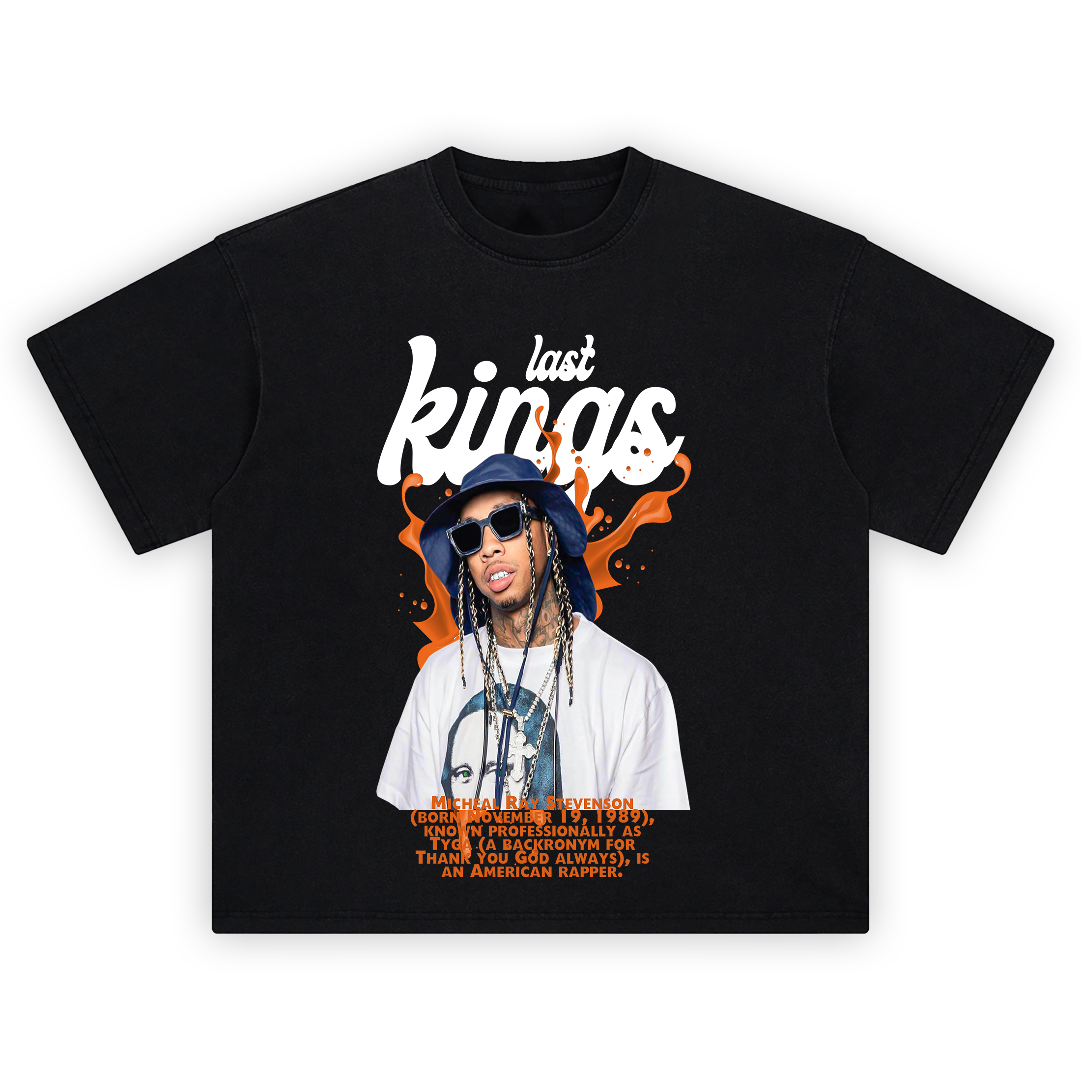 Turn heads with this eye-catching Last Kings Tyga Tee, a bold tribute to the king of West Coast vibes. Featuring Tyga in oversized shades, rocking a statement chain and bucket hat, this design explodes with flavor thanks to the vibrant orange paint splash and striking Last Kings logo. Whether you’re a fan of his music or his iconic streetwear brand, this tee delivers pure energy and attitude.