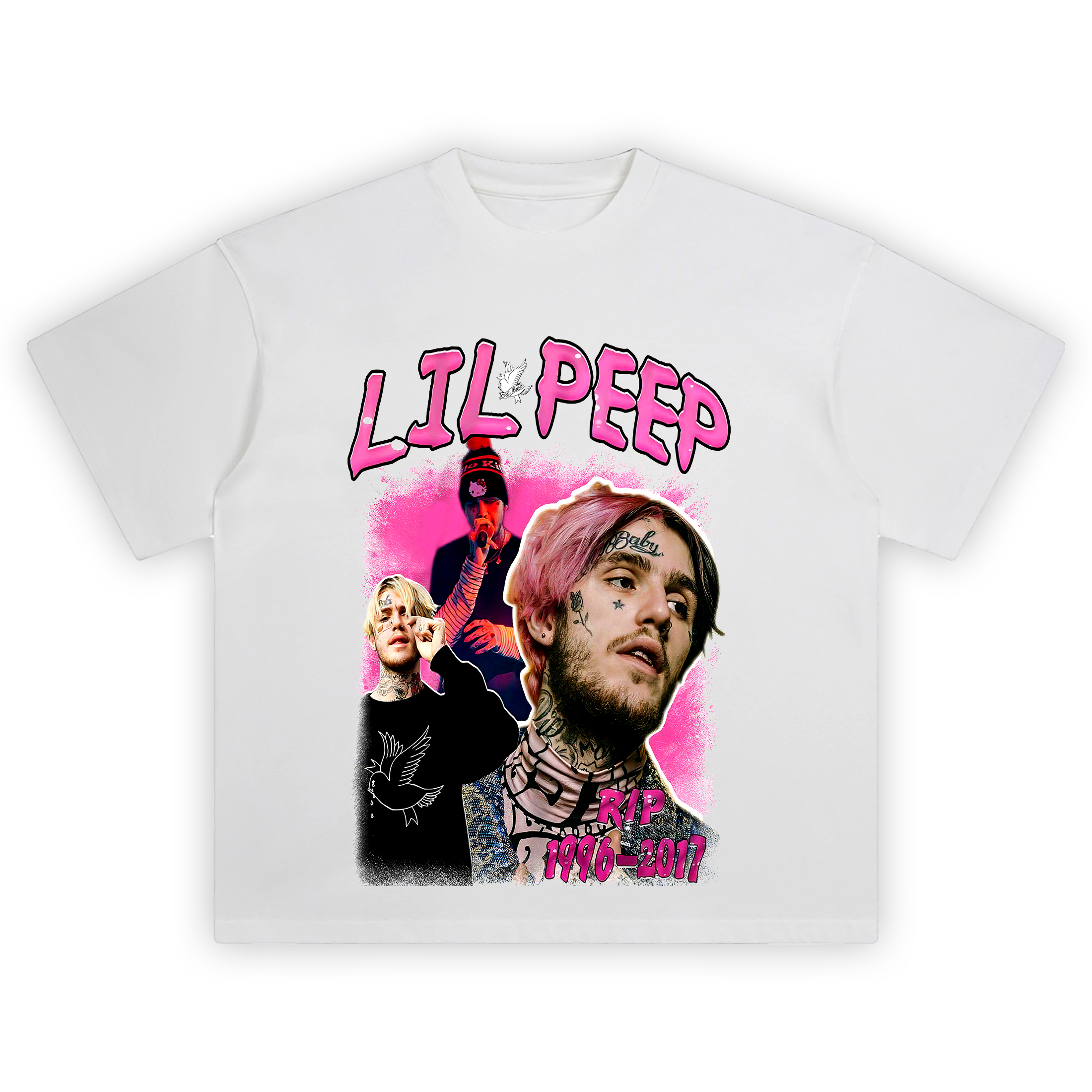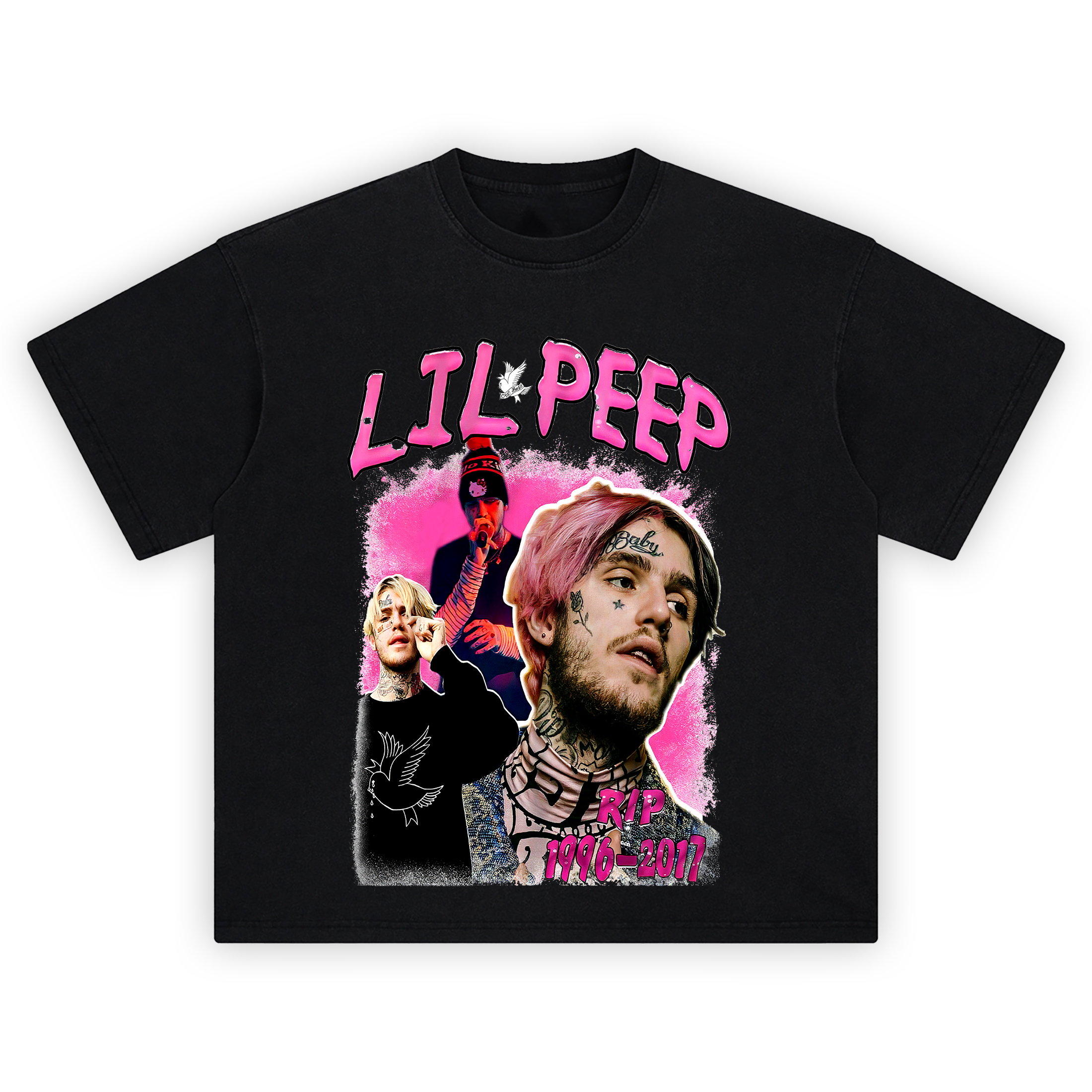 The Lil Peep Forever Graphic T-shirt is an emotional tribute to the late emo rap pioneer whose vulnerability reshaped a genre. Featuring a vivid collage of Peepโs iconic pink hair, face tattoos, and raw energy on stage, this tee immortalizes the artist who made sadness stylish and authenticity powerful.