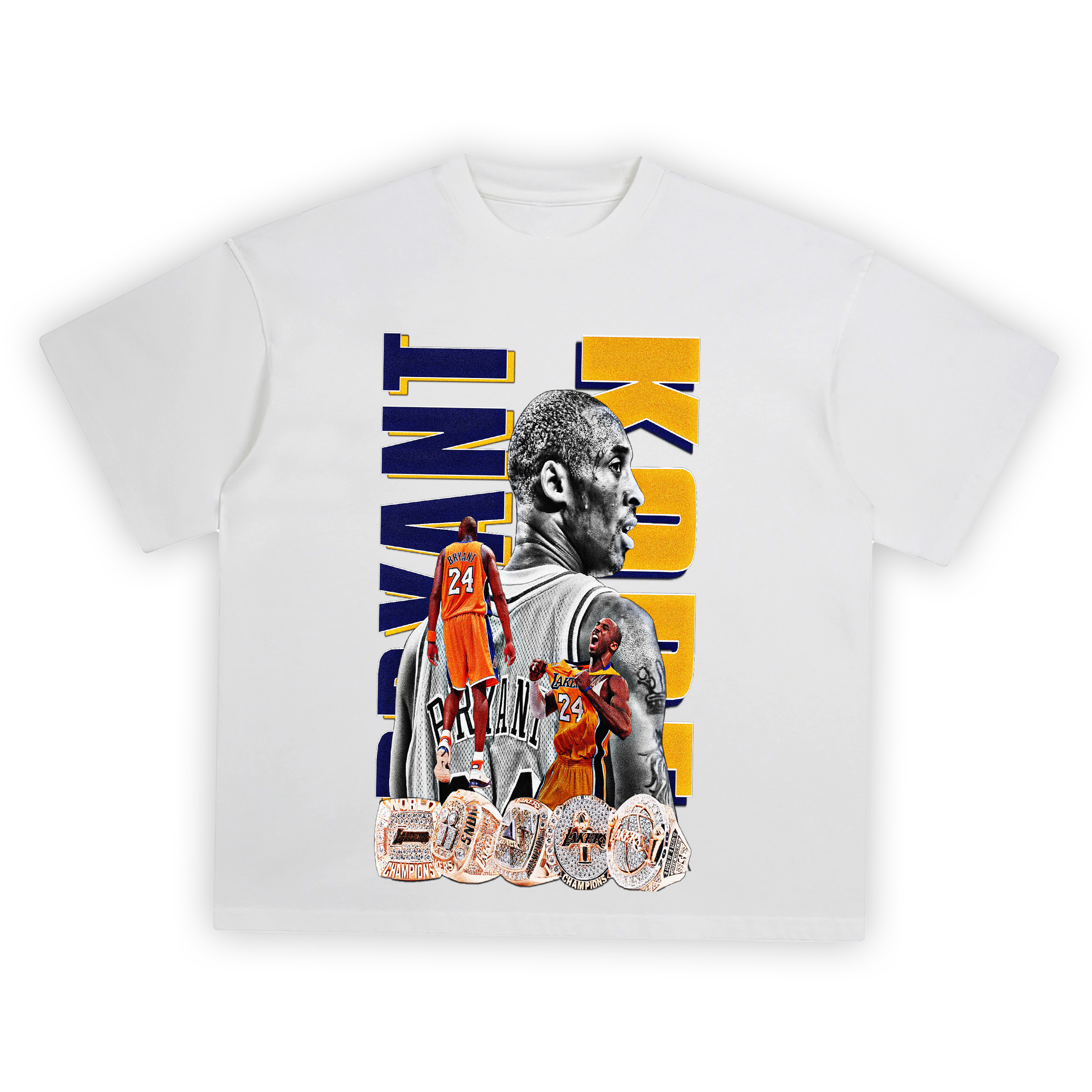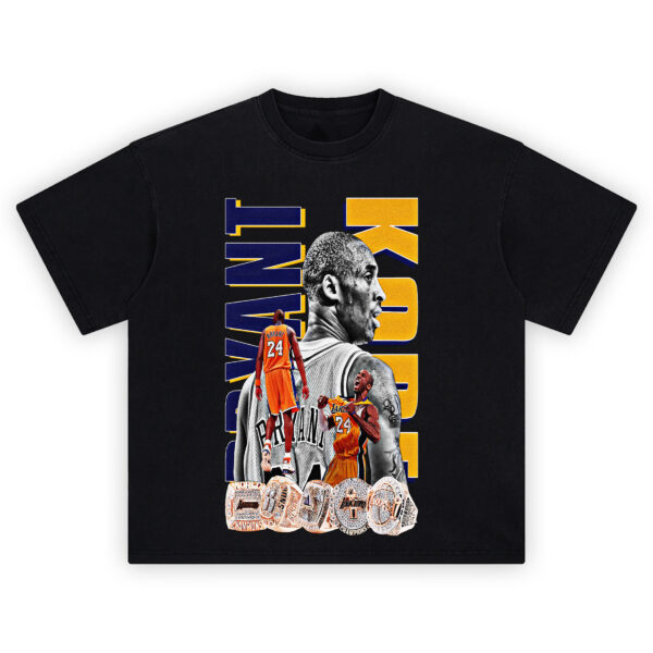 Channel greatness with the Mamba Mentality T-shirt, a tribute to the relentless drive and legacy of Kobe Bryant. This bold graphic tee features a collage of Kobe in iconic Lakers gold and purple, surrounded by championship rings and moments of on-court intensity that defined a generation.