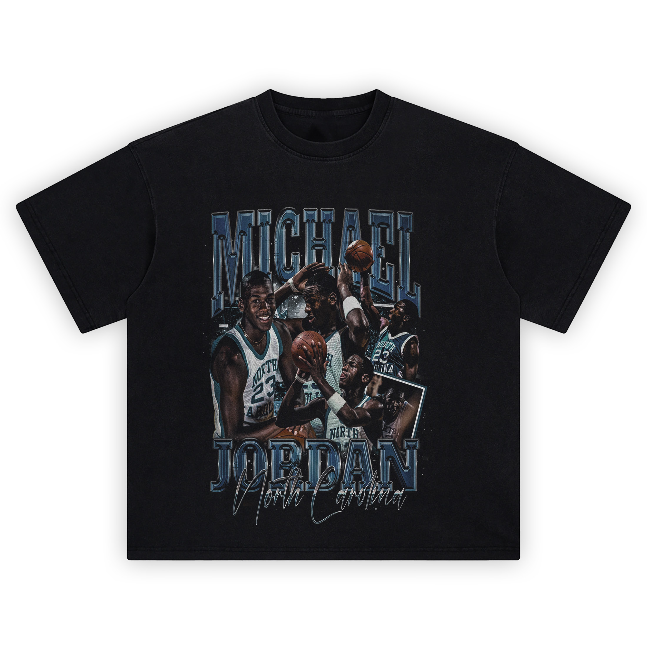 The Michael Jordan North Carolina Shirt throws it back to Chapel Hill greatness with a bold, court-ready design. Front and center, multiple action shots of number 23 in that unmistakable Carolina blue jersey stack together—smiles, drive, and hang time—all framed by giant chrome-style lettering that spells MICHAEL up top and JORDAN across the bottom. A script “North Carolina” tag glides over the base like a signature, while the cool blue palette keeps everything authentically Tar Heel. Crisp edges, light grain, and trophy-light highlights give each pose depth without overcrowding the layout, so the Michael Jordan North Carolina Shirt reads loud from across the room and clean up close. It’s pure college-era nostalgia: warm-up swagger, baseline drives, and the rise of a legend before the pro banners. Pair the Michael Jordan North Carolina Shirt with black denim and white sneakers for watch parties, campus strolls, or everyday hoops style; toss on a varsity jacket and let the big block type do the talking. If your rotation lives for classic college basketball energy and timeless blue-and-white fits, this tee is an instant starter.