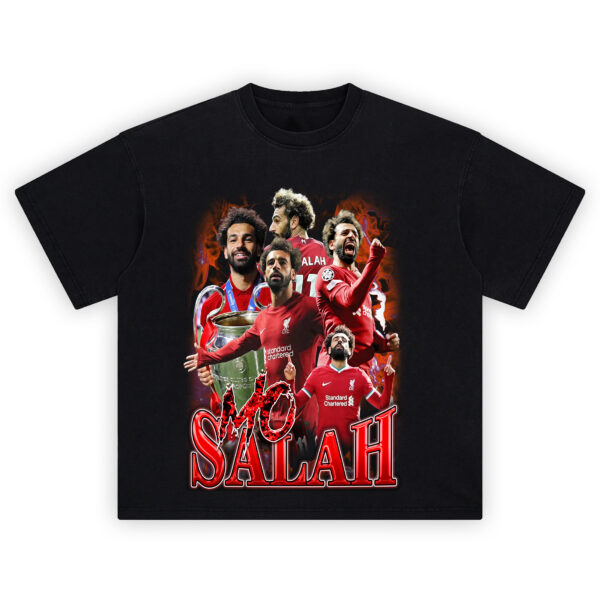 Turn the Kop up to eleven with the Mo Salah red collage shirt. This design erupts like a terrace chant: a blazing orange-red flame backdrop frames a tight collage of Salah moments in Liverpool red. Front and center, Mo stares down the camera in the LFC crest, flanked by a roaring goal celebration and a calm, eyes-closed point-to-the-sky pose. Behind him, a back view with the “11” name-set anchors the composition, while another panel shows him flexing mid-sprint. At the left, he hoists a massive silver trophy, ribbons curling around the handles—pure statement energy. The typography blasts “MO SALAH” across the bottom in oversized, beveled red letters with a cracked “MO” tag splashed on top, matching the fiery vibe. It’s unapologetically collage—layered portraits, dynamic crops, and stadium-poster drama all in one piece. Color story stays bold: Liverpool crimson, white sponsor marks, and inferno oranges licking the edges. Style it with black cargos, a tech jacket, or a simple denim pair and let the graphic do the talking. Whether you remember those European nights or you’re living for the next net-rip, the Mo Salah red collage shirt brings that king-of-Anfield aura to your daily rotation. Grab the Mo Salah red collage shirt and walk on with fire.