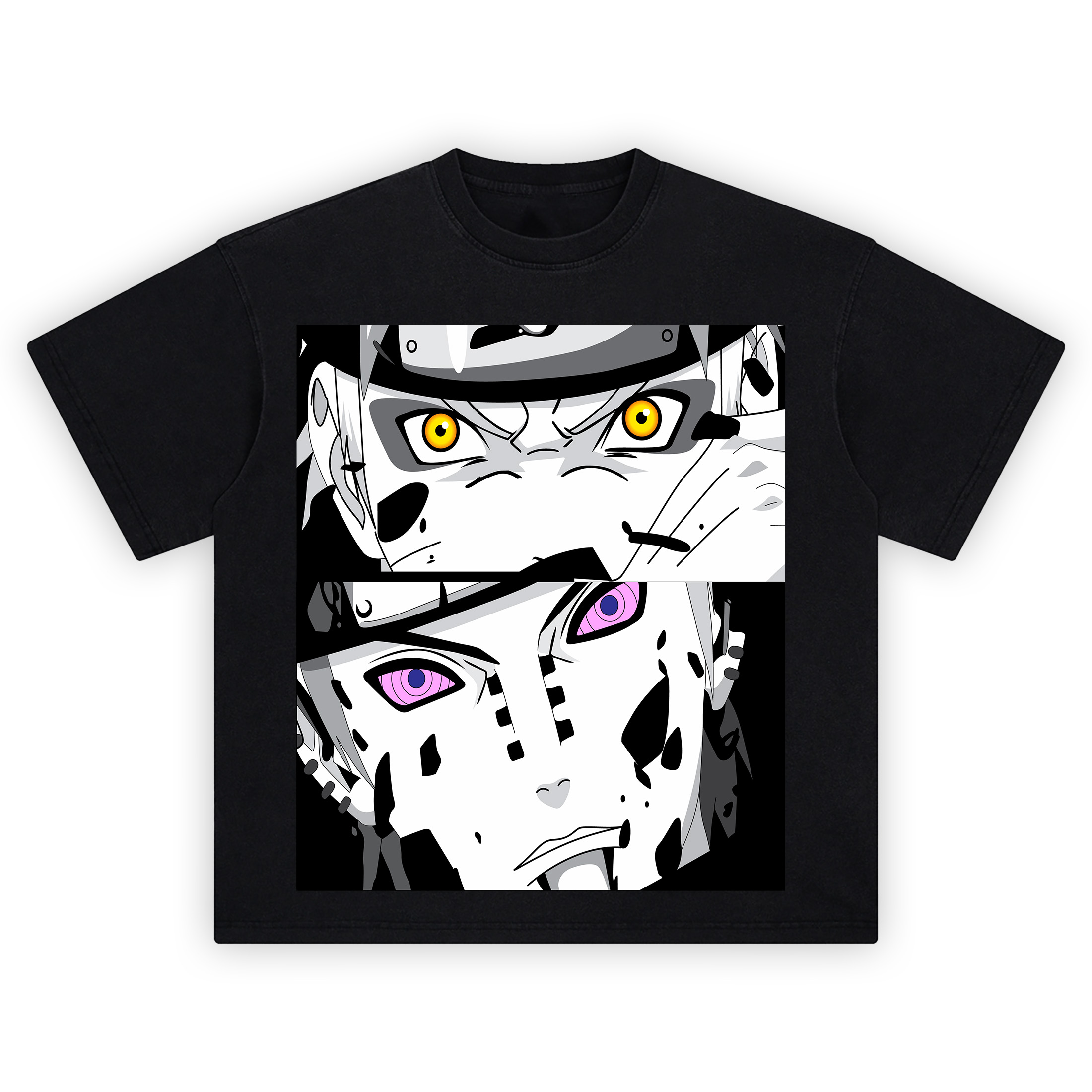 The Naruto vs Pain Shirt captures a pure goosebumps moment in two razor-sharp panels. Up top, blazing yellow eyes lock forward beneath a metal forehead protector; shadows cut across the cheeks and nose, amplifying that battle focus. Down below, the stare flips to cool menace—concentric purple rings, piercings, and ink-black markings that creep across the face. The split composition turns the Naruto vs Pain Shirt into instant storytelling: willpower clashing with cold judgment, light against void. Minimal colors punch hard—white highlights, deep blacks, stormy grays, and those iconic eye hues that fans spot from across the hall at any con. Clean vector lines keep everything crisp, from the etched creases around the brows to the bold blocks of shadow that sell the tension. It’s a tee built for marathon rewatch nights, figure shelf dustings, and arena-sized theme songs stuck in your head. Style the Naruto vs Pain Shirt with a black overshirt and cargos for stealth heat, or let it headline your fit with denim and high-tops. If your wardrobe lives for iconic face-offs and eye detail that tells the whole story, the Naruto vs Pain Shirt belongs in your rotation—no filler, just peak shounen energy.