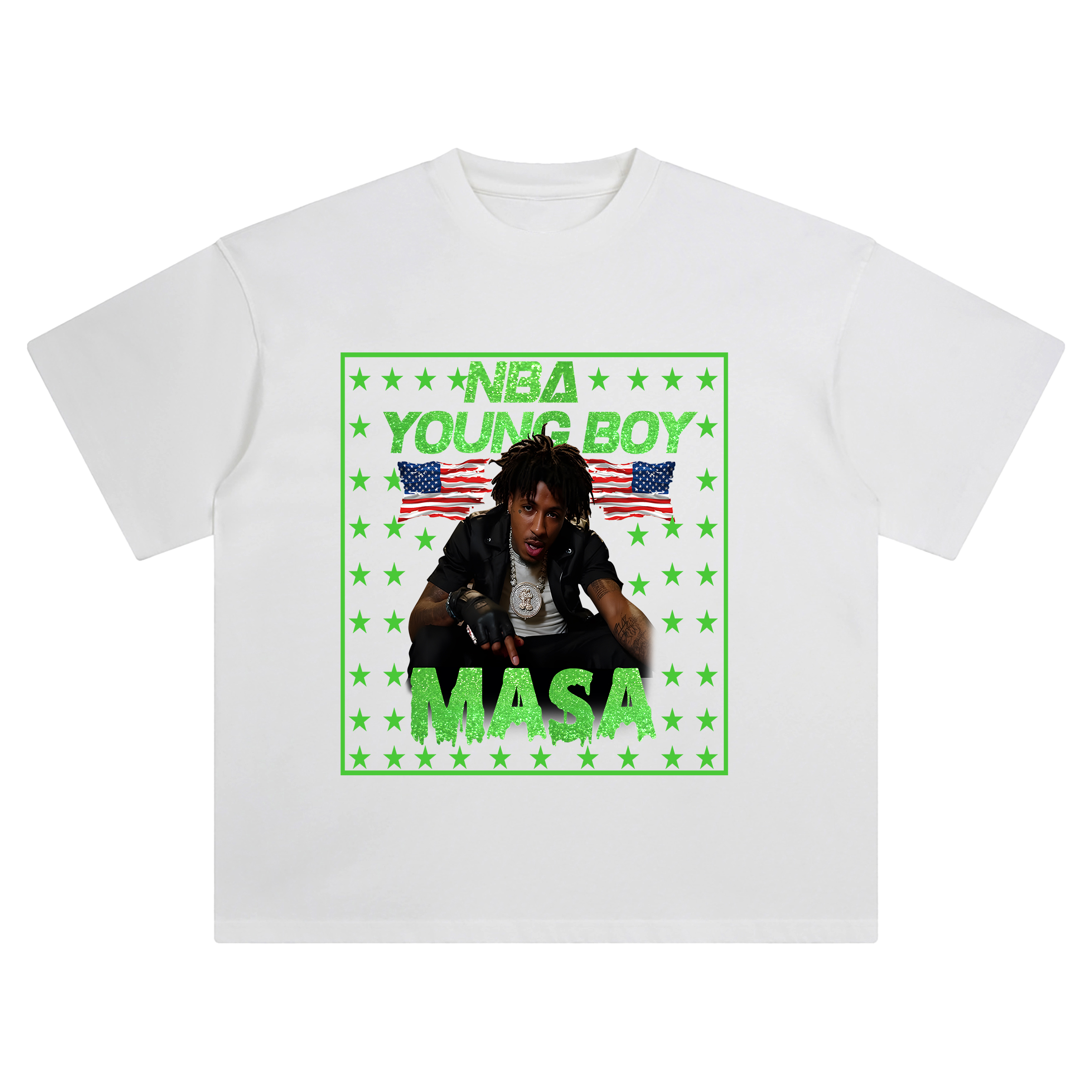 Wave your flag and rep the movement loud with the NBA YoungBoy MASA Tour Flag Stars T Shirtโa tribute to YoungBoy’s unstoppable rise and the patriotic rebellion of the MASA Tour. This standout design captures NBA YoungBoy front and center, framed by a blaze of vibrant green stars, tattered American flags, and bold glitter-dripped lettering that screams MASA in unapologetic style.