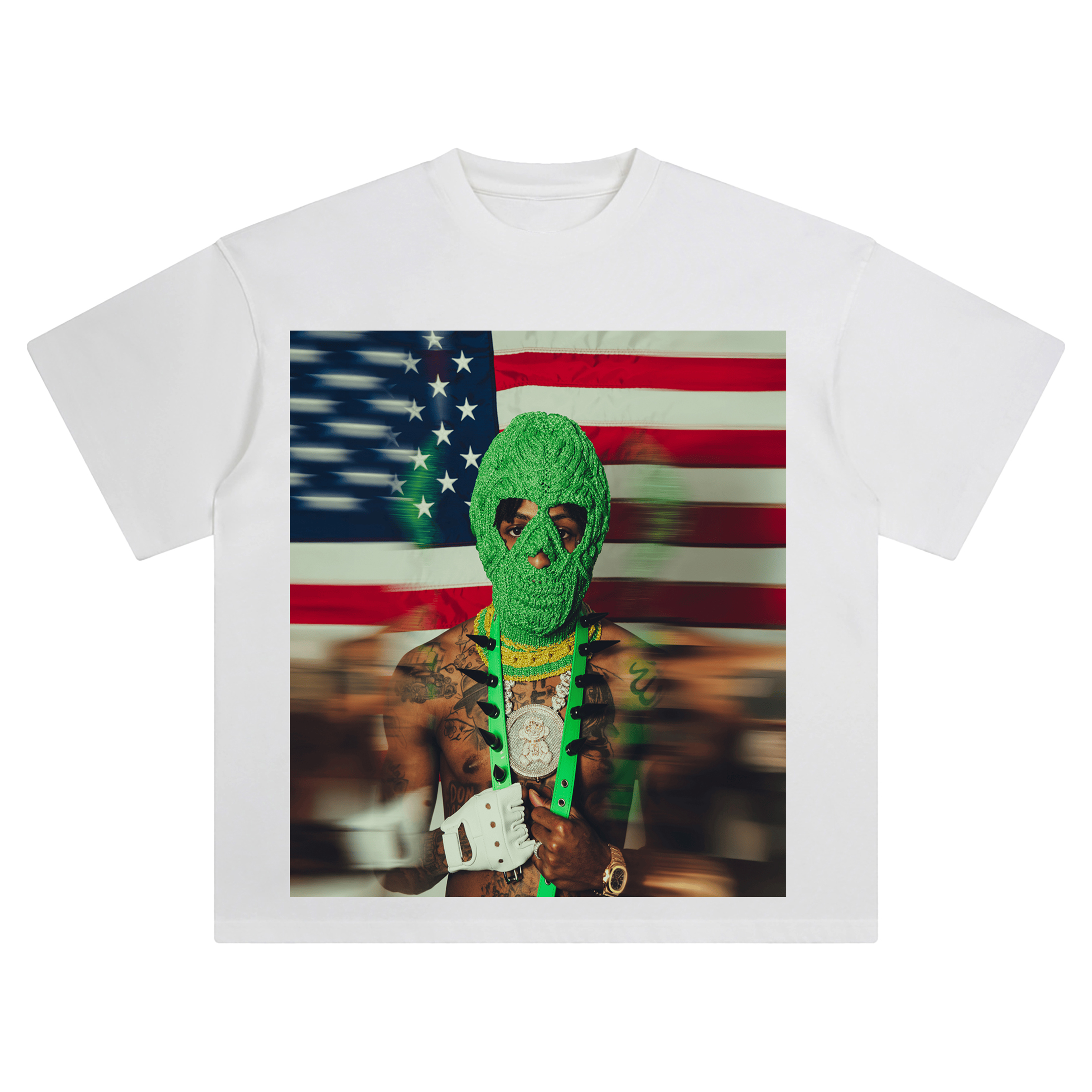 Show your allegiance to the movement with the NBA YoungBoy MASA Tour T Shirt โ a high-impact graphic tee that captures the mystique and energy of his latest era. This design features YoungBoy in a striking green knit mask against a blurred American flag backdrop, symbolizing both rebellion and identity. His signature look is combined with bold contrasts and streetwear edge to reflect the raw intensity of the MASA tour.