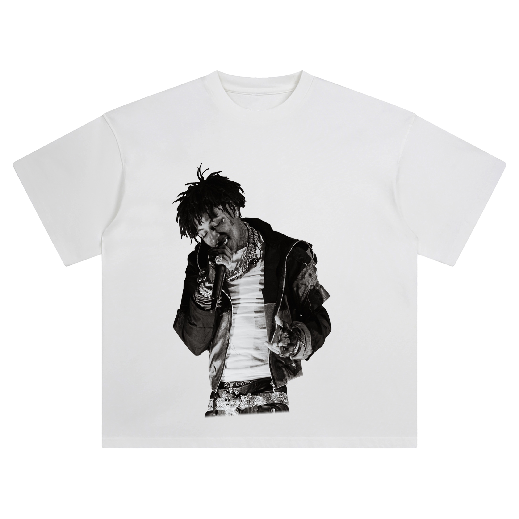 The design shows YoungBoy mid-verse, gripping the mic with emotion carved into his face, chains glinting, layers of streetwear stacked with power. Every wrinkle in his jacket, every ice-studded detail of his belt, and the ghostly glint in his eyes come alive in grayscaleโlike a timeless moment suspended between the beat and the bar.