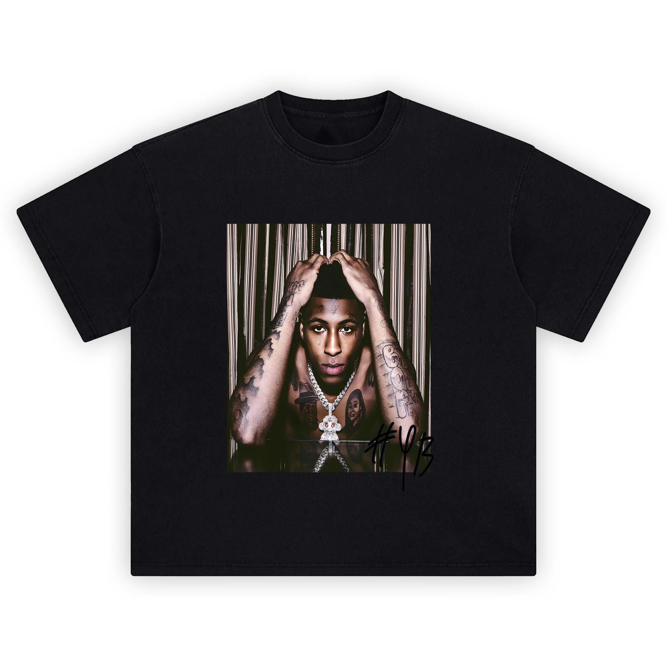 Step into the mind of one of hip-hop’s most enigmatic figures with the NBA YoungBoy Reflections Photo T Shirt—a raw, introspective piece that captures YoungBoy in a moment of stillness and defiance. Framed against a dramatic curtain backdrop, this iconic image shows YB staring down the lens with heart and history inked across his skin. The bold pendant, the glint of his chain, and the sharp reflection on the glass below elevate the image into a visual anthem of resilience.