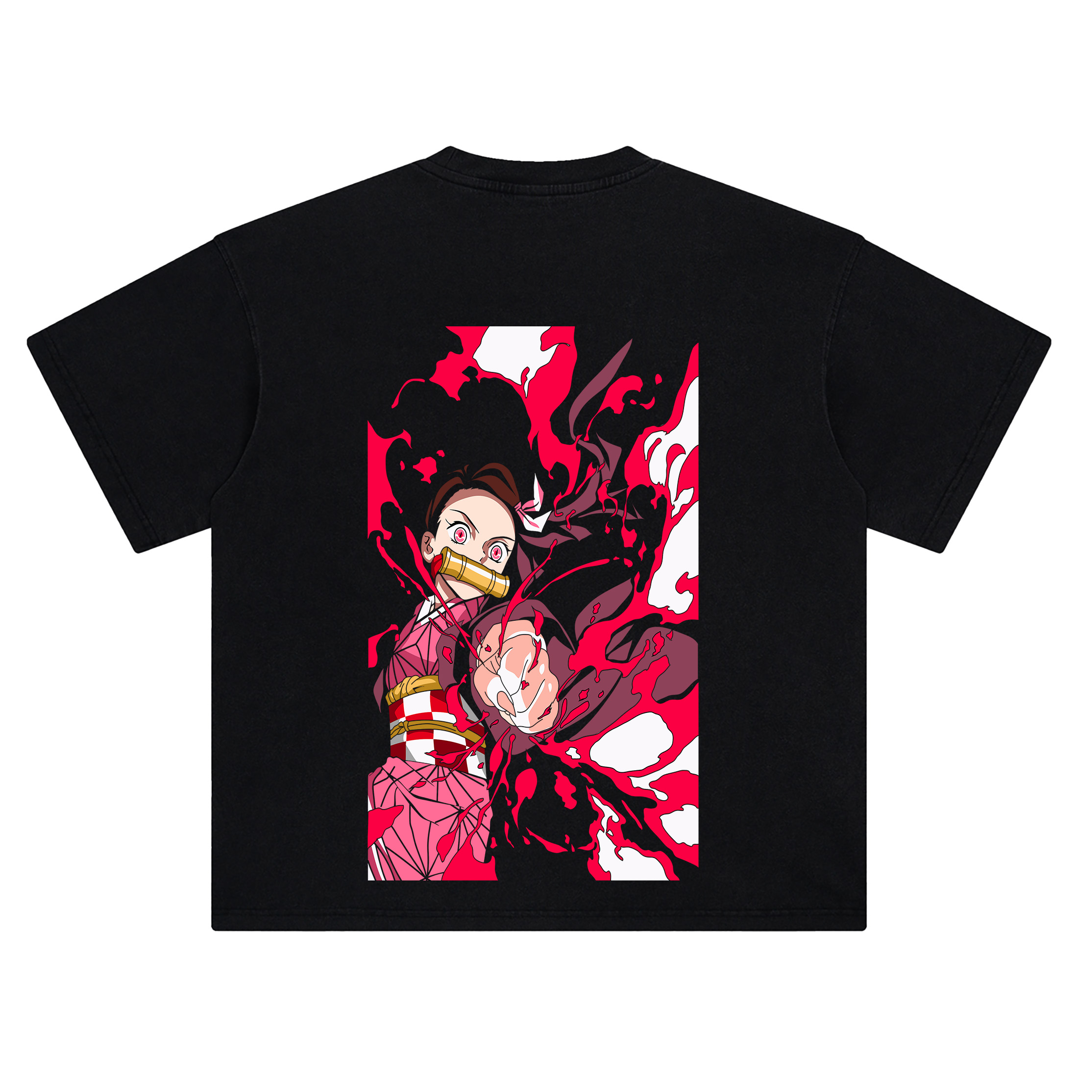 The Nezuko Blood Demon Art shirt is for fans who love quiet-cute up front and feral Nezuko on the flip. The chest hit is a tiny chibi Nezuko Kamado—round pink eyes, side hair ribbon, and the trademark bamboo muzzle—peeking from the left chest for a low-key wink to Demon Slayer. On the back, Nezuko explodes into a full-frame vector scene: lunging forward with clawed hand extended, eyes blazing pink as swirling crimson/black blood splashes ripple behind her—a clear callout to her Blood Demon Art. The panel captures her layered kimono look with pink geometric patterning, red-white obi details, and flowing dark sleeves whipping through the impact waves. Bold linework and high-contrast blocks (pink, red, white, black) push that poster-grade anime vibe.