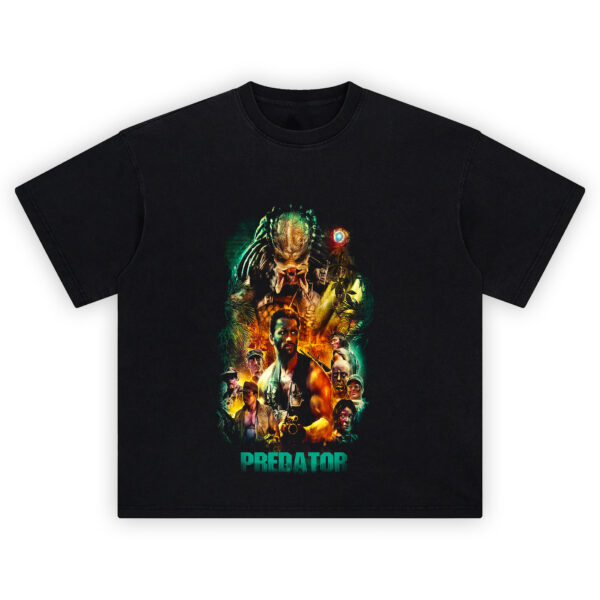 Gear up with the Predator Jungle Warfare Graphic T-Shirt, capturing the explosive intensity of the 1987 sci-fi action classic. Featuring Dutch (Arnold Schwarzenegger) front and center, surrounded by his elite squad and the menacing Predator looming above, this shirt packs all the jungle heat and survival grit in a single epic design.